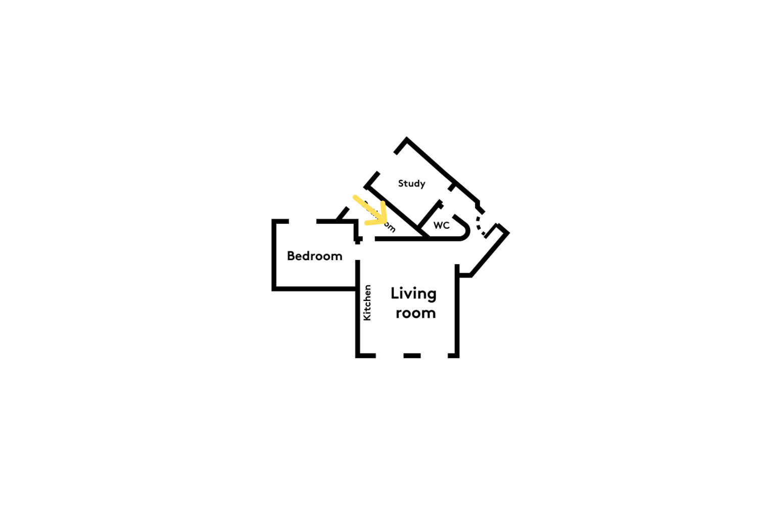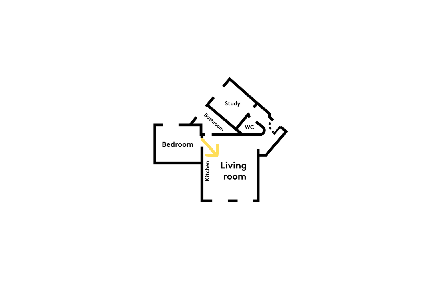 Deux courbes, deux couleurs, deux seuils : voilà les caractéristiques qui structurent le projet et cela dès l’entrée, avec une première silhouette incurvée jaune qui guide vers le séjour.