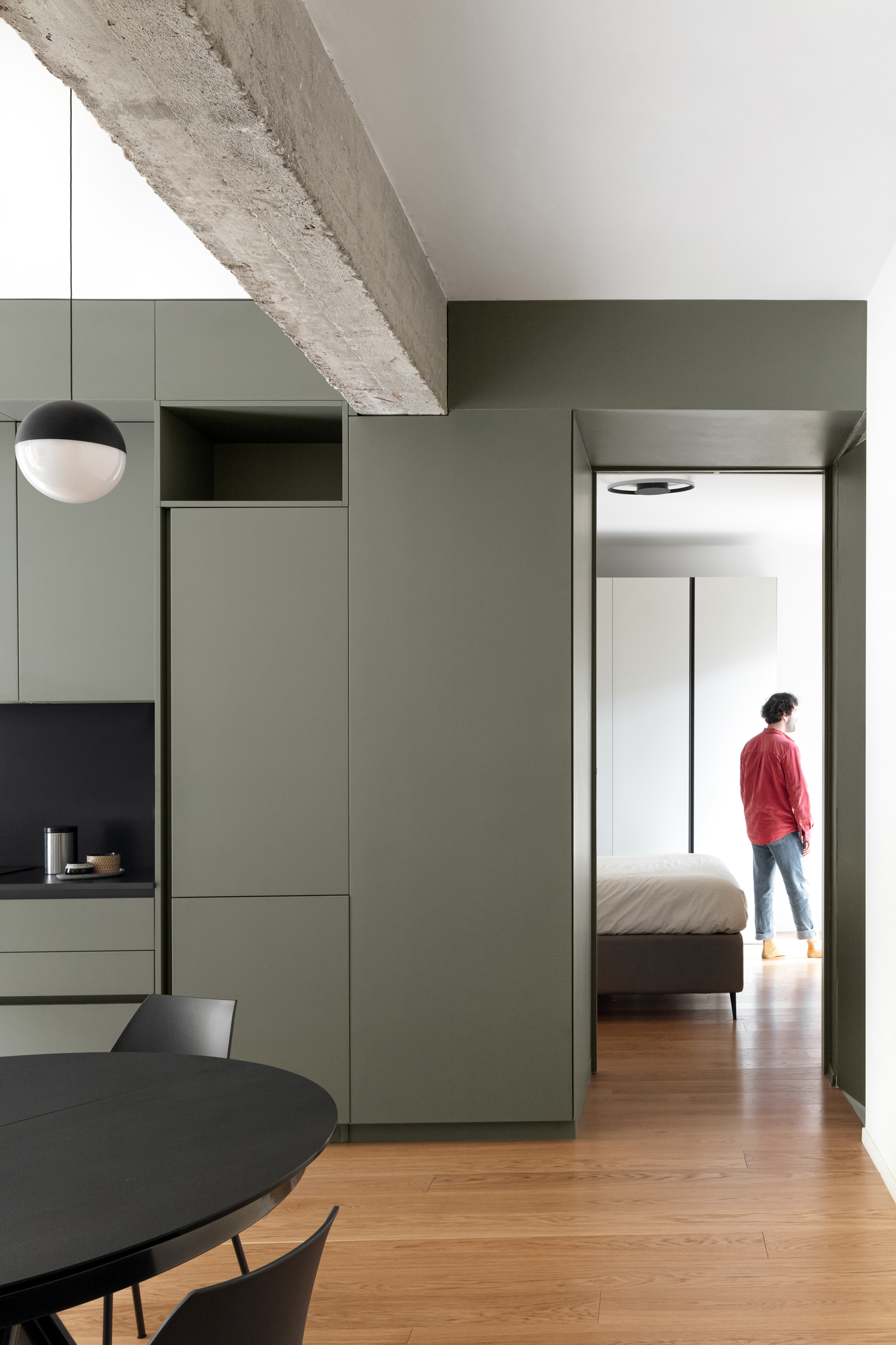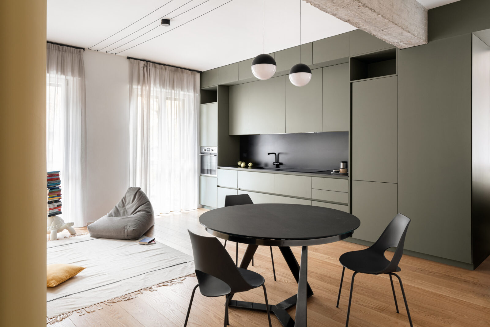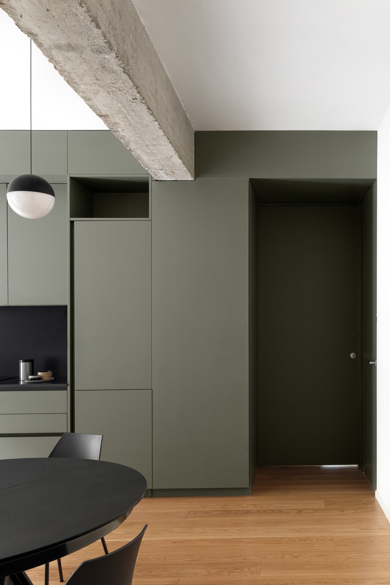 Face à cette première touche de couleur, la cuisine s’affirme avec sa teinte vert kaki. Une couleur vibrante qui crée un cadre idéal pour accueillir du mobilier moderne, tel que la table et les chaises noires de Bontempi Casa.