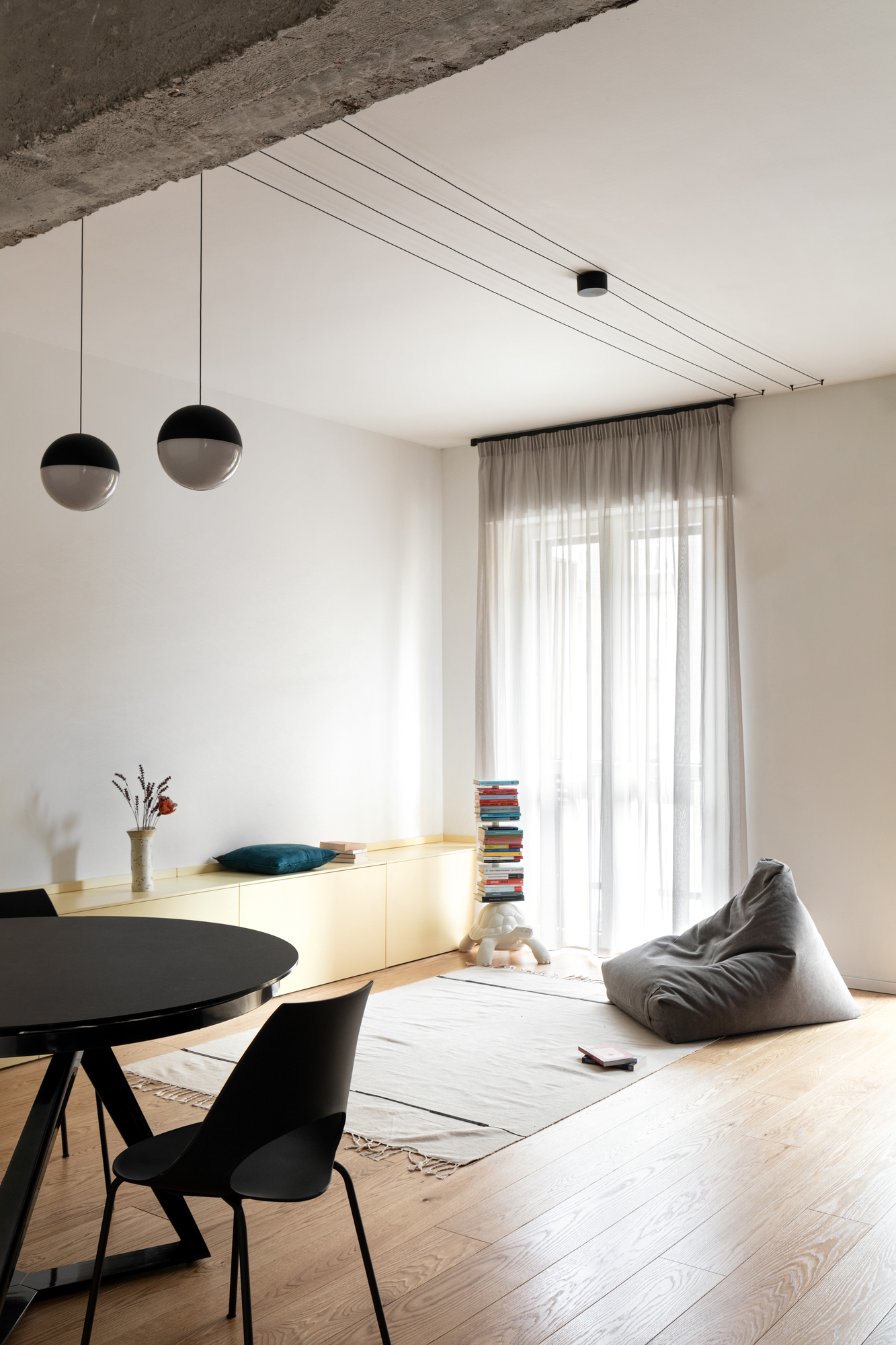 Malgré l’interdiction d’installer un faux plafond en raison du système de chauffage centralisé au plafond, la contrainte se transforme en opportunité : la poutre déshabillée devient un élément central et structurant du projet.