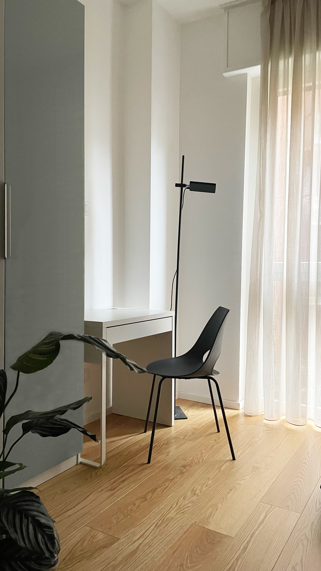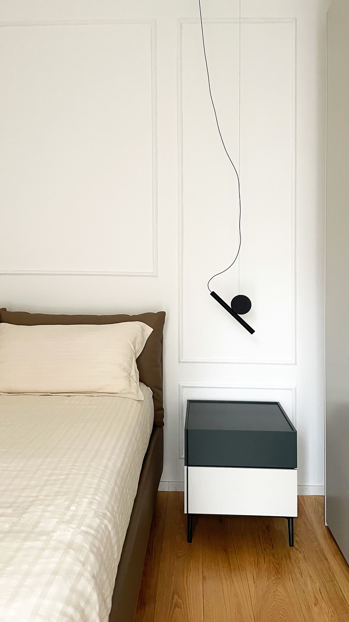 Derrière l’espace cuisine, la chambre principale respire la sobriété, jouant des nuances douces et des meubles épurés, à l’image de l’applique noire Doi de LucePlan à la silhouette très graphique.