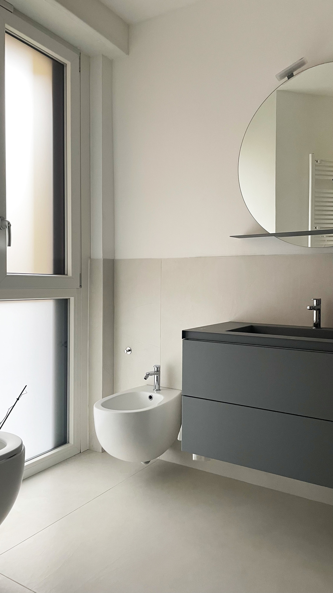 Dans la salle d’eau attenante, le minimalisme se poursuit avec des teintes minérales subtiles…