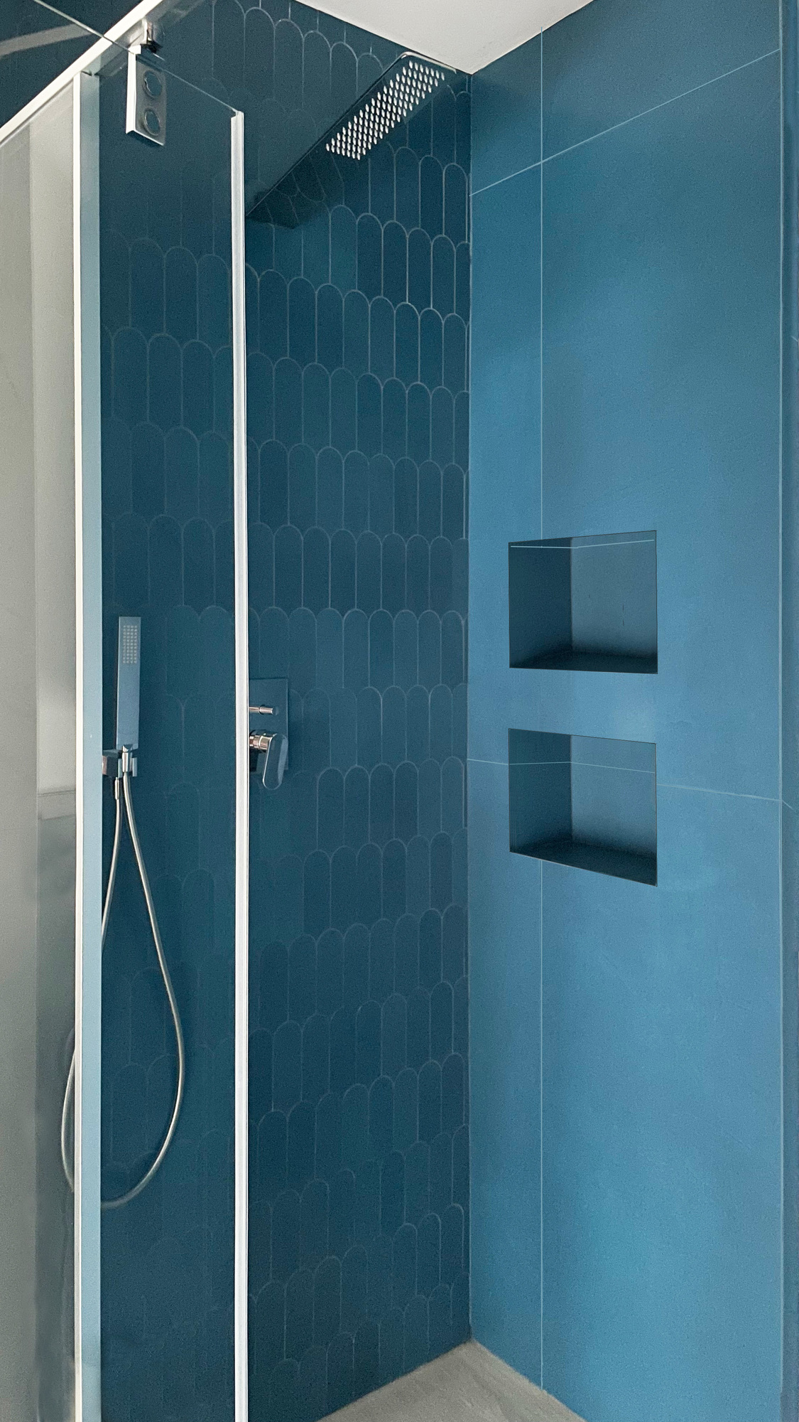 … qui contrastent avec l’espace de la douche, où des plaques et carreaux en céramique bleue d’Atlas Concorde apportent une touche dynamique et vivifiante !