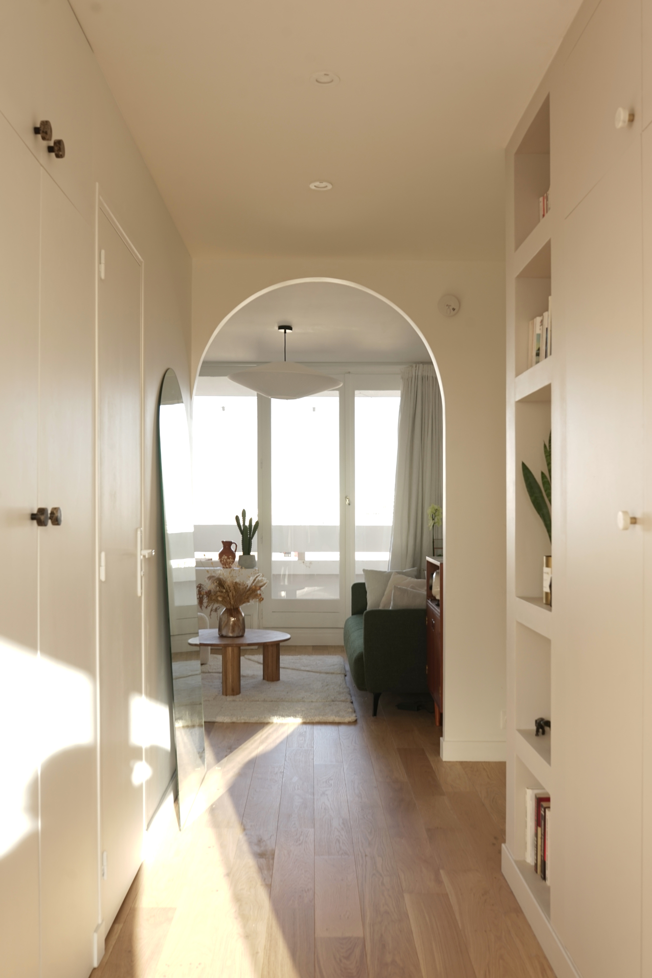 L’entrée se pare de rangements sur mesure, tout en prenant soin d’ouvrir la perspective vers le salon. Les rayons de soleil laissent deviner tous les atouts d’un plan traversant…