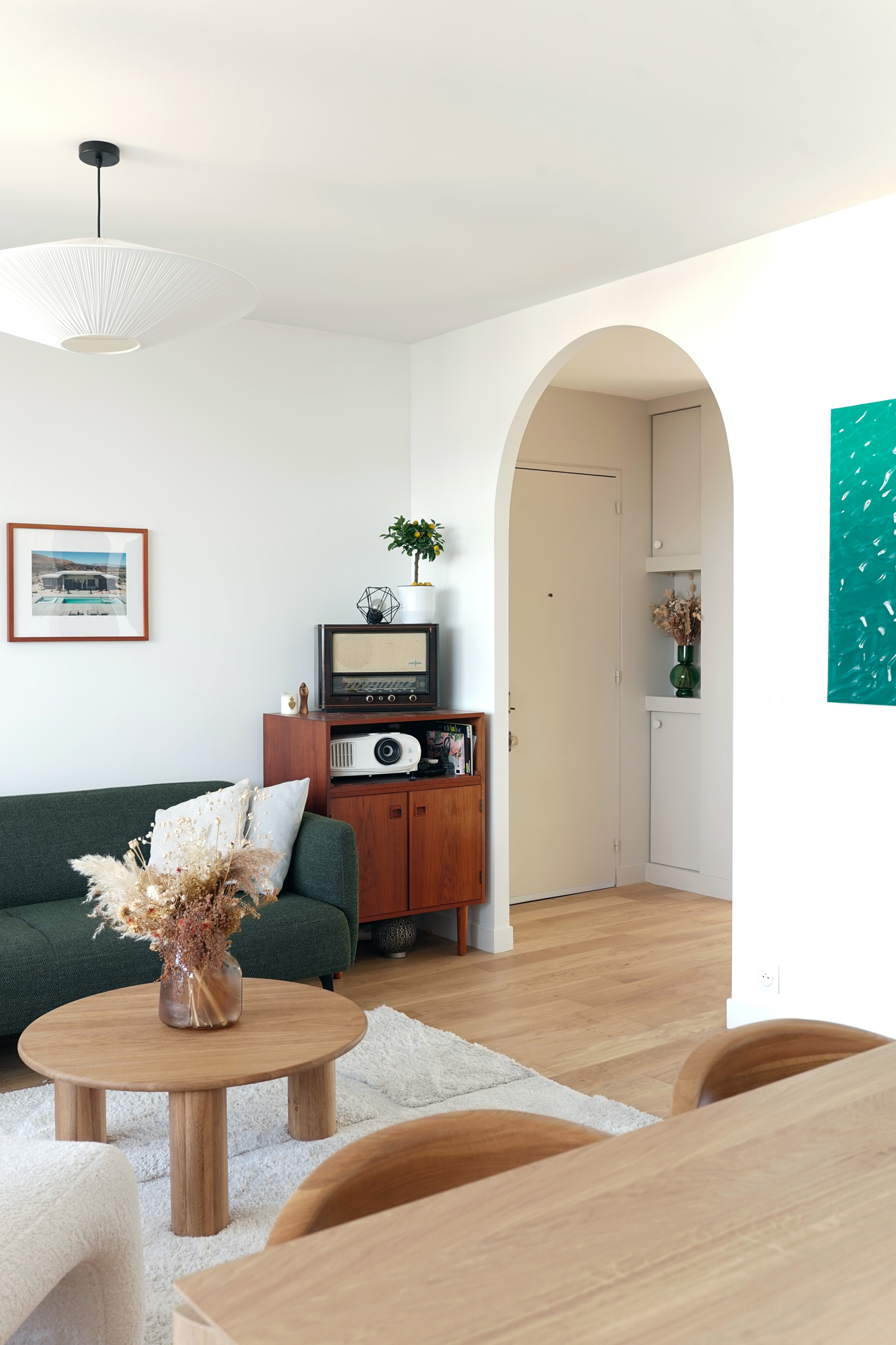 Les rondeurs de l’arche et du mobilier instaurent une douce ambiance, qui devient tout à fait singulière avec les touches de décoration vintage.