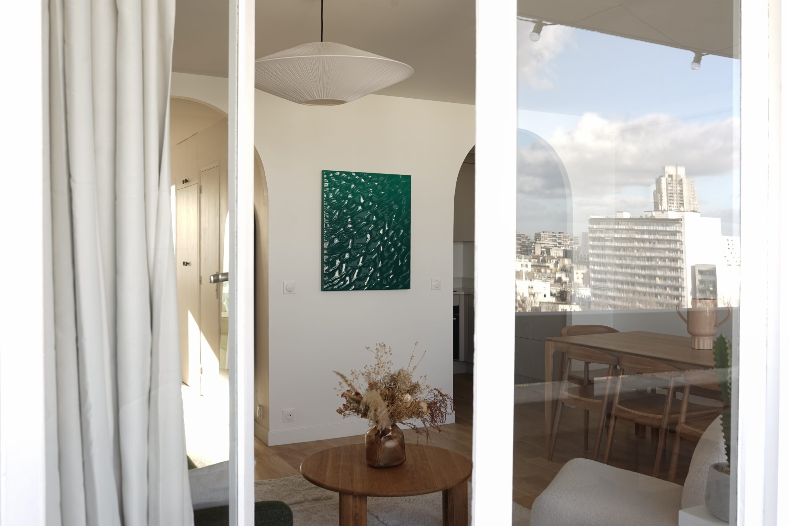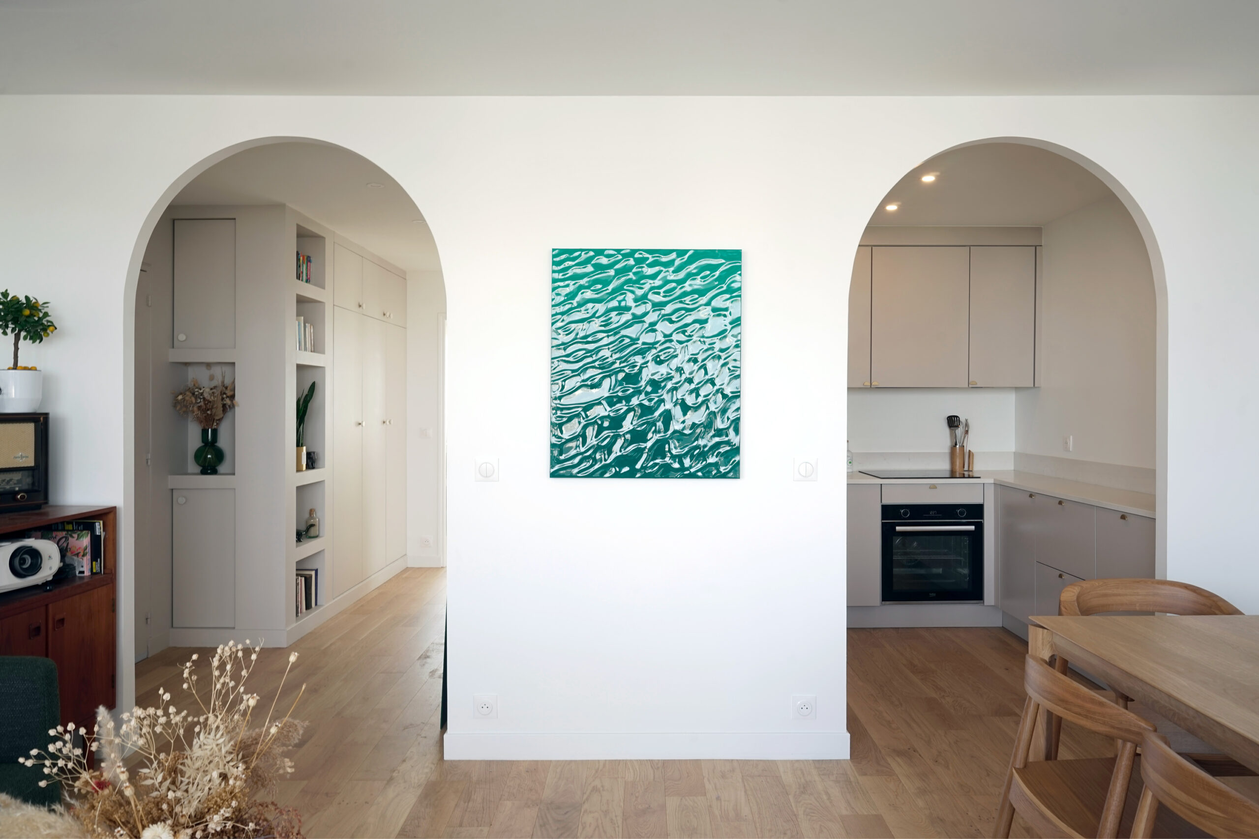 L’objectif de ces ouvertures est de valoriser la vue depuis chaque pièce, tout en veillant à conserver une séparation des espaces. Au centre, une délicate œuvre de l’artiste Guillaume Grando alias @supakitch_, qui transporte notre esprit au large.