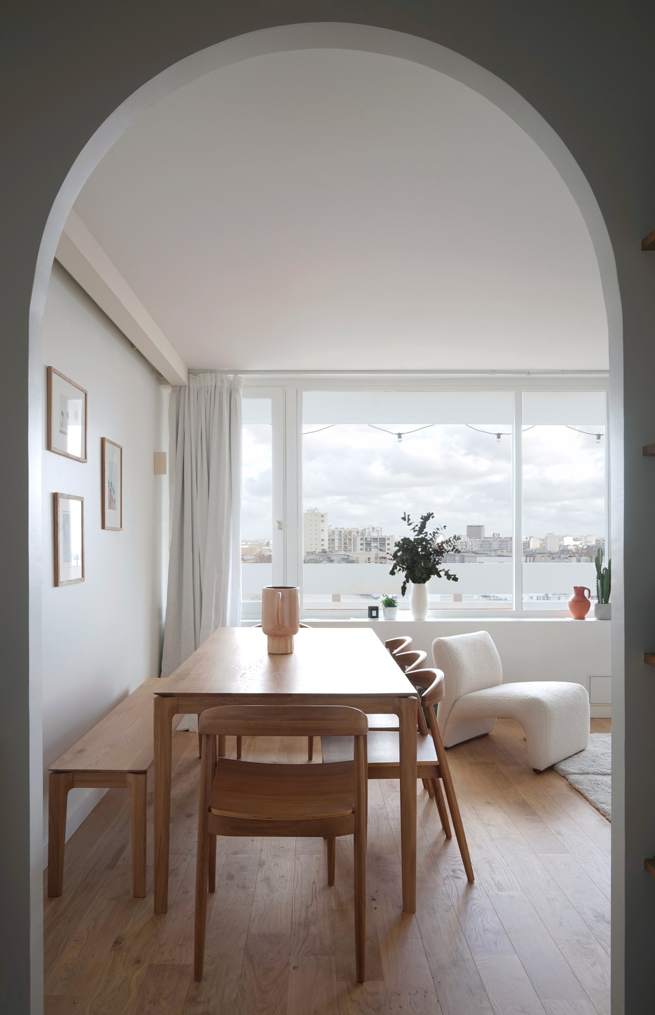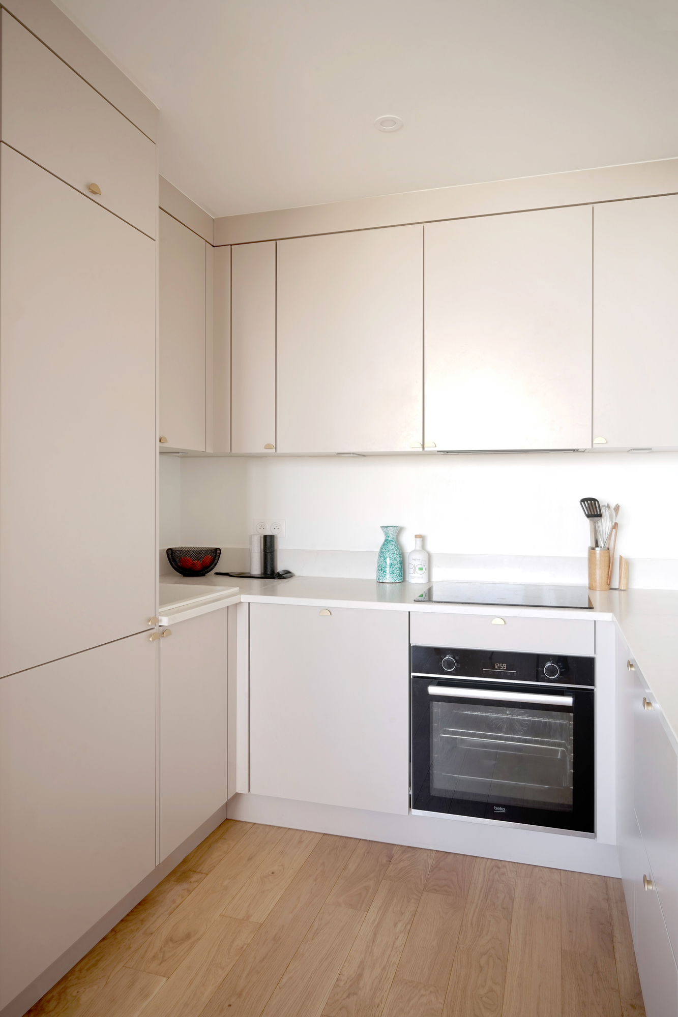 La cuisine vient se lover au coeur de cette alcôve, optimisée par des placards toute hauteur. Les couleurs neutres, en ton sur ton, permettent de ne pas surcharger visuellement cet espace compact.