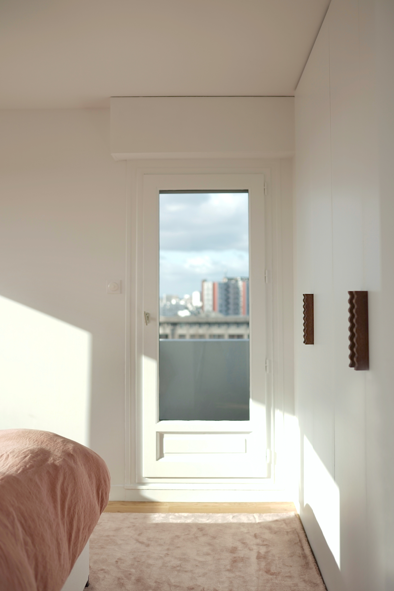 La chambre réserve la surprise d’un autre espace extérieur ! Pour accéder au balcon, les pieds foulent avec délice un épais tapis. Les tons poudrés parachèvent l’idée d’un cocon propice au repos et au bien-être.
