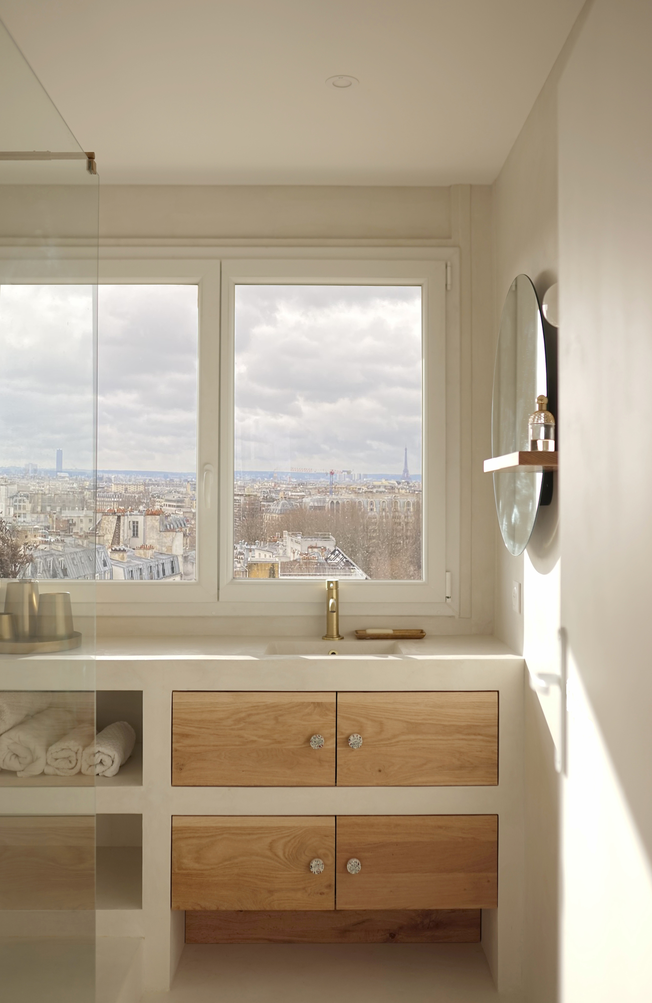 La vue sur Paris est à couper le souffle depuis la salle d’eau en béton ciré @mercadier.decoration. Qui peut se targuer de prendre une douche en admirant Montmartre ?