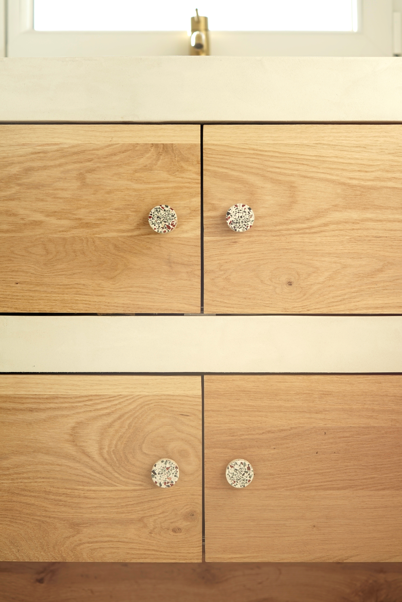 On en oublierait presque ces adorables boutons de porte en terrazzo. Leur grain de malice réhausse immédiatement l’ambiance !