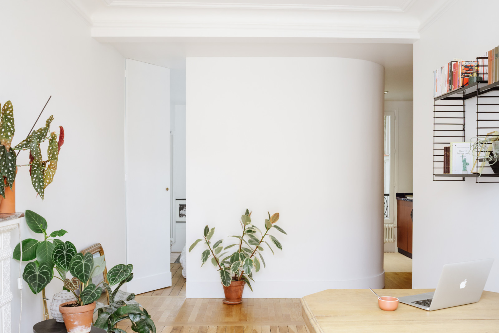 Une plinthe placée à la base de la porte de la chambre permet à celle-ci de s’intégrer dans le prolongement du mur courbe.