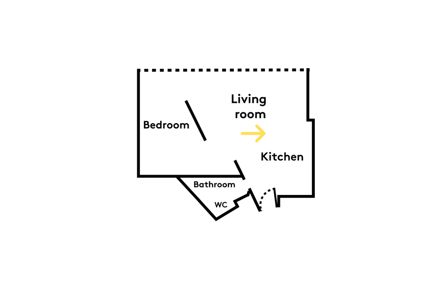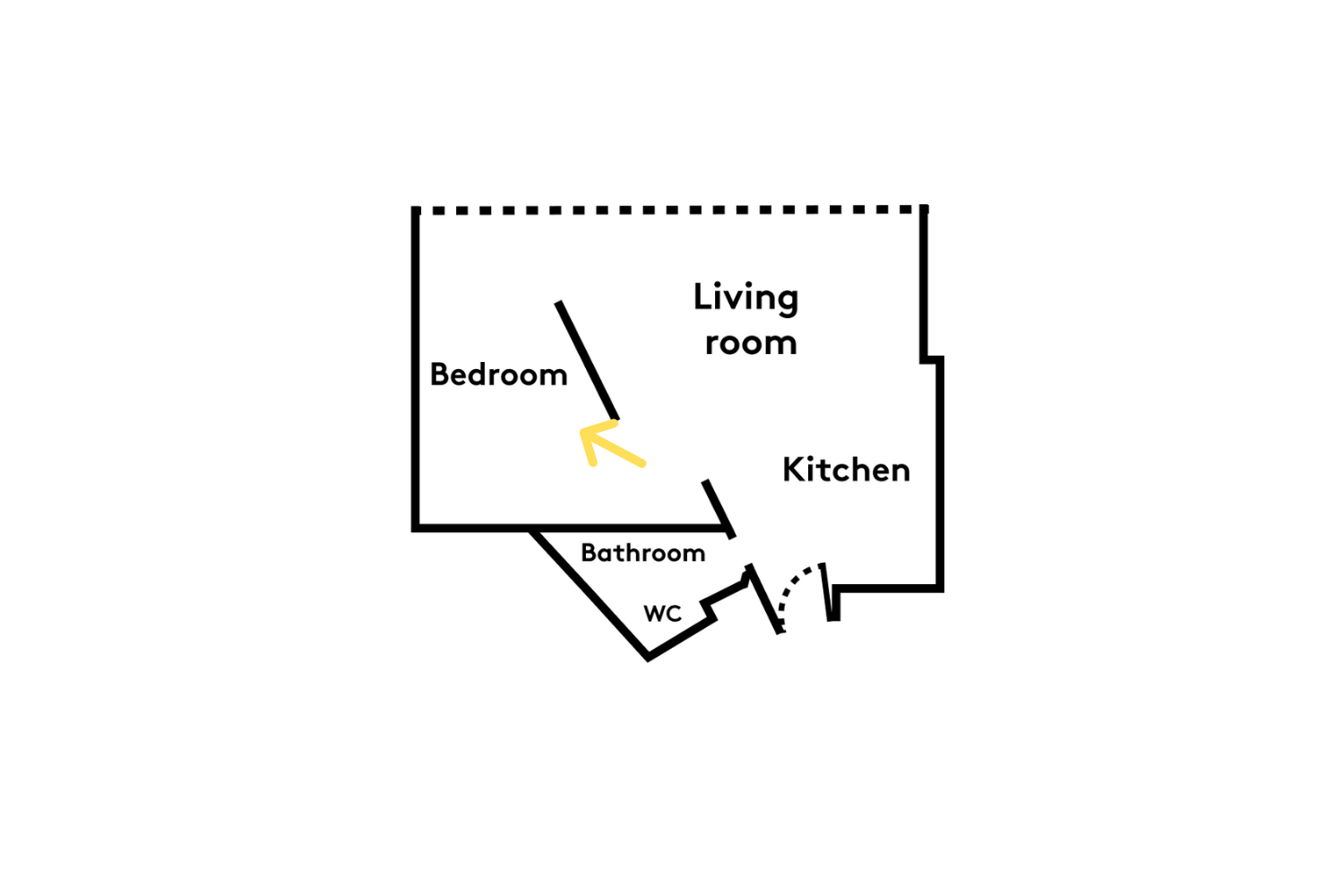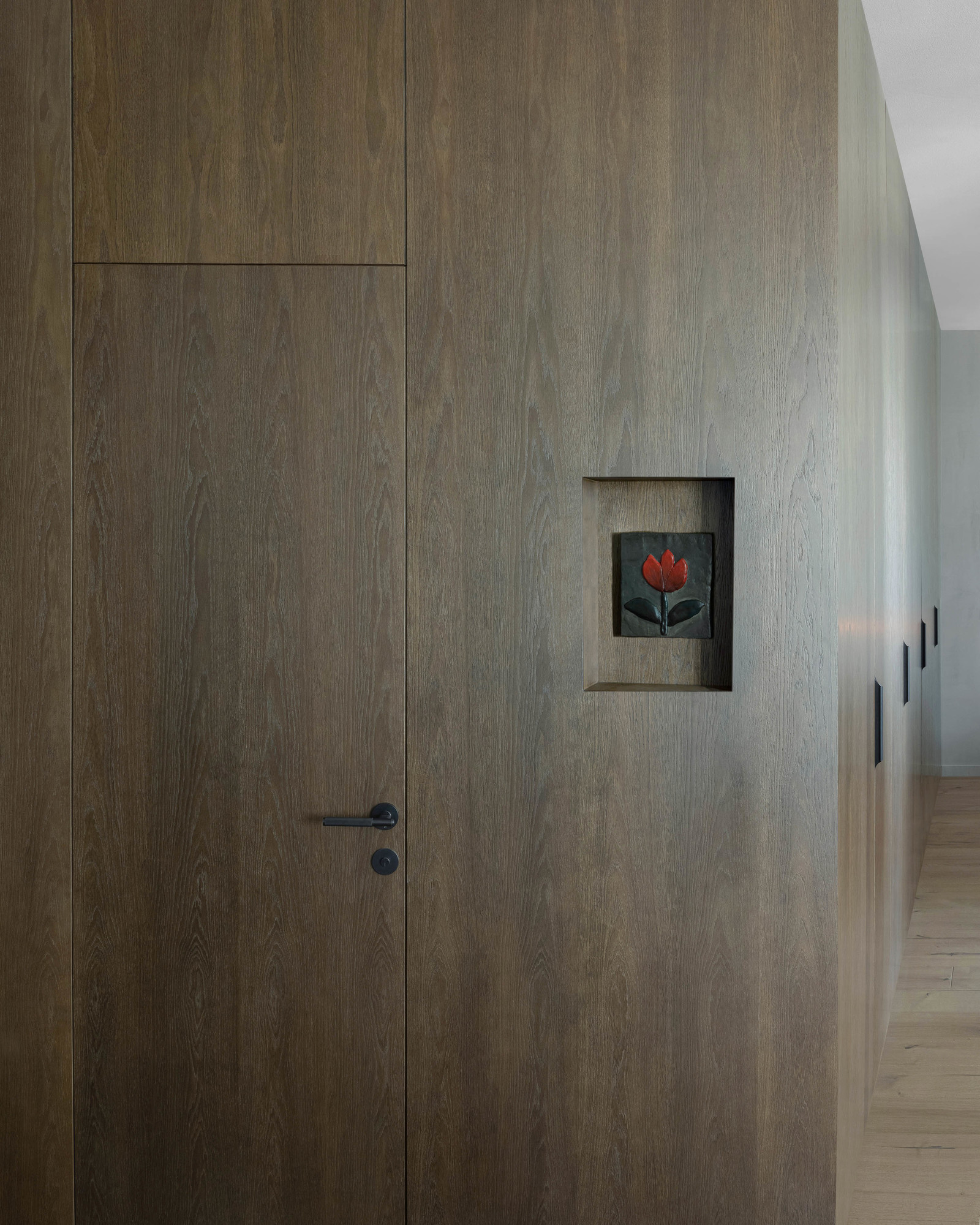 Ce même matériau habille deux pans de mur entiers : des placards côté salon et chambre, mais aussi l’accès à la salle d’eau…