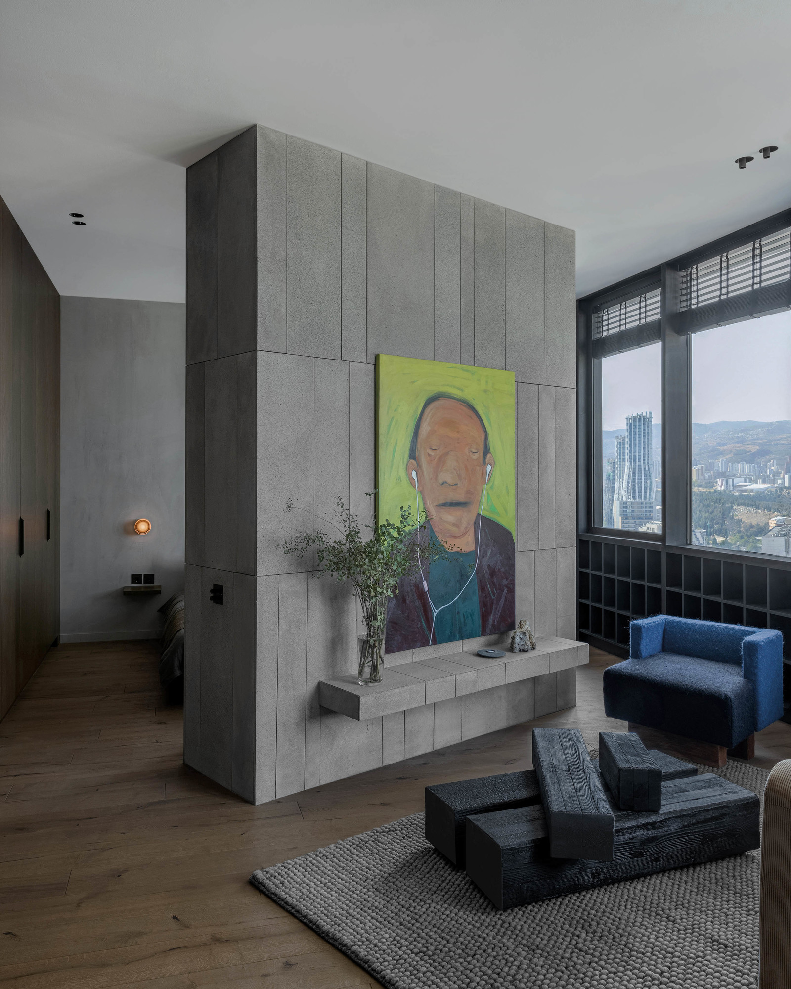 La colonne structurelle du bâtiment fait partie intégrante de l’aménagement intérieur. Sa présence est adoucie par un parement en pierre de basalte géorgien.