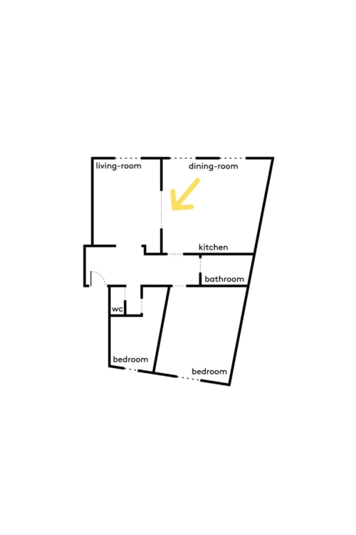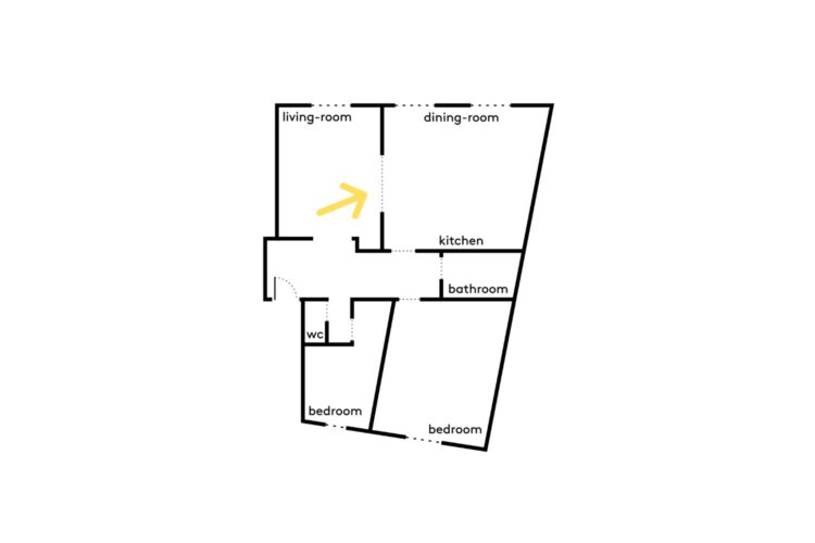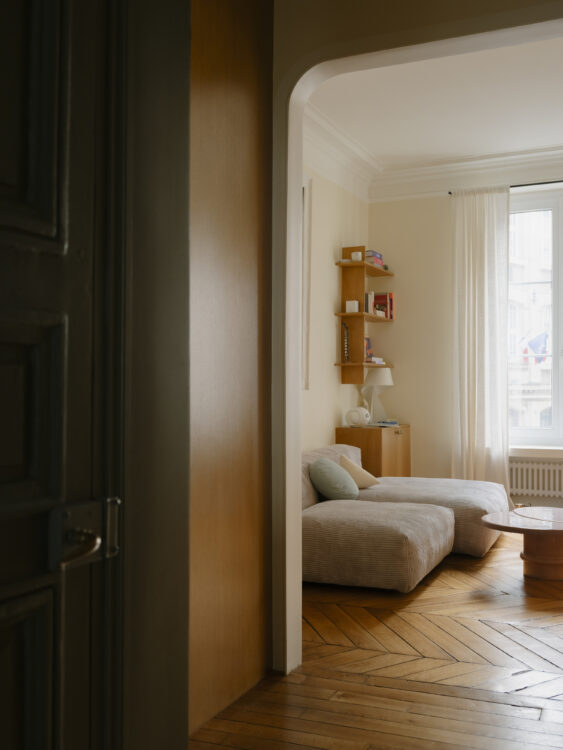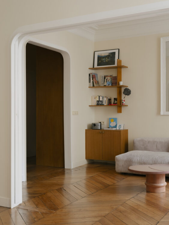 Dans le double séjour, le passé dialogue avec le présent : intégré au sein des moulures, un écran de projection peut transformer l’espace en salle de cinéma. Des portes coulissantes, dissimulées dans un cadre cintré, permettent d’isoler chacun des deux espaces, tout en préservant la fluidité des circulations.