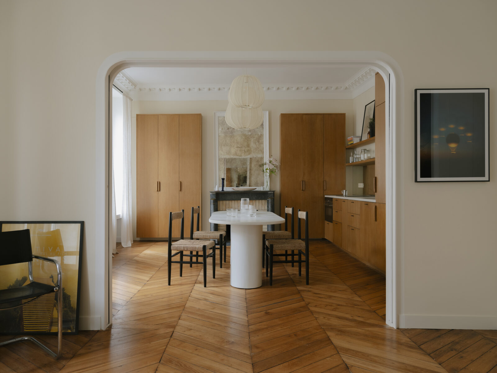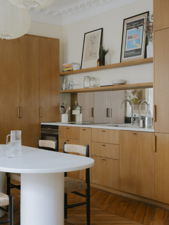 La cuisine ouverte se pare de la même essence de bois que les vaisseliers, qui se tiennent de part et d’autre de la cheminée. Quant à la crédence en miroir, elle reflète les œuvres présentes dans le salon, tout en maximisant la perspective.