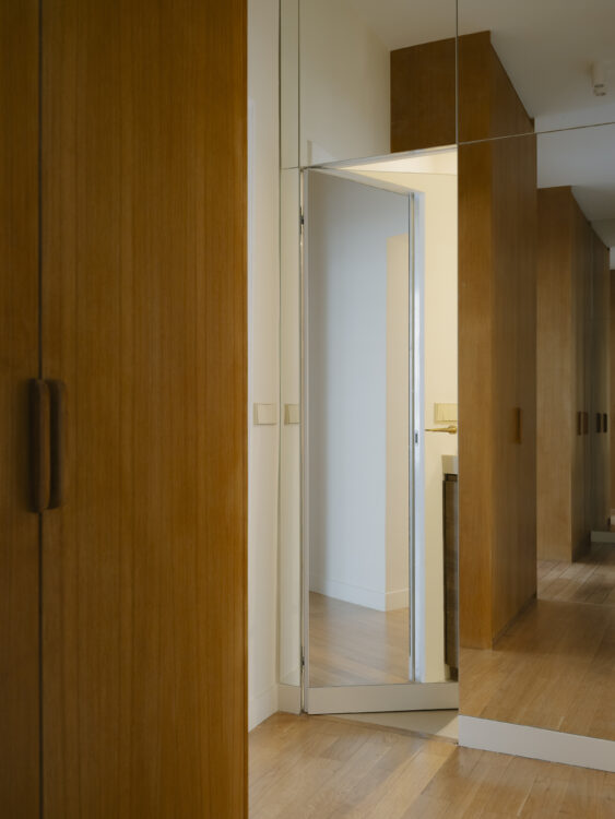 Depuis le double séjour, un bain de lumière naturelle se fraie un chemin jusqu’à l’entrée, révélant l’imposante hauteur des placards en chêne verni qui rythment le couloir.