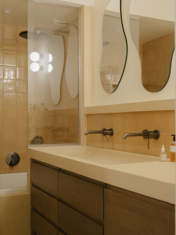 La pièce conserve un vocabulaire formel en continuité avec le reste de l’appartement : une vasque en béton ciré brun clair, du mobilier en chêne teinté foncé et une robinetterie en chrome anthracite, le tout dans un subtil jeu de textures.