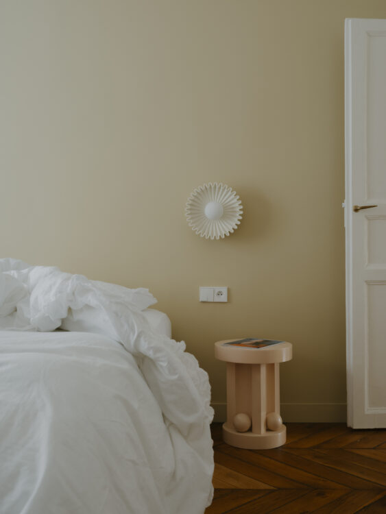 Dans la chambre parentale, des appliques murales Ostro de Simone & Marcel ornent un mur doré, faisant office de tête de lit.