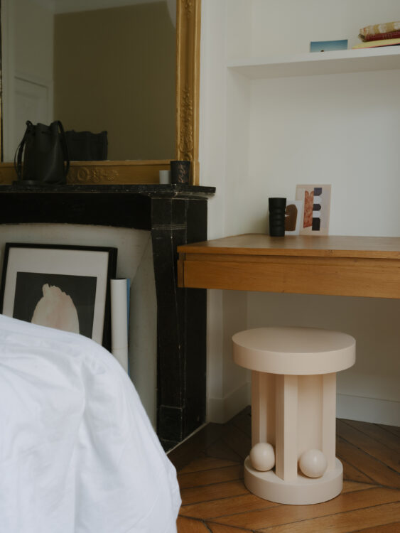 Un bureau en chêne intégré fait écho à l’esprit boisé des autres pièces et prolonge les intentions de l’architecte, qui a également optimisé l’espace nuit avec l’ajout d’un immense dressing s’effaçant dans la cloison.