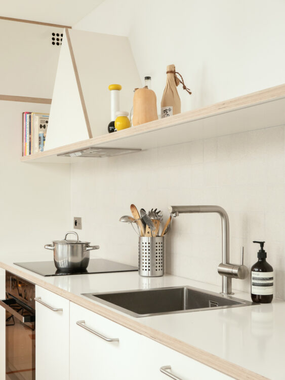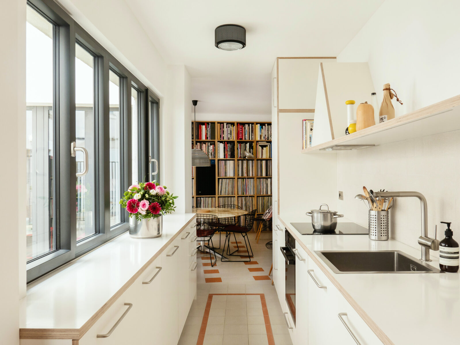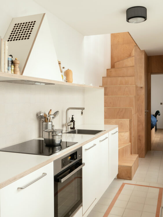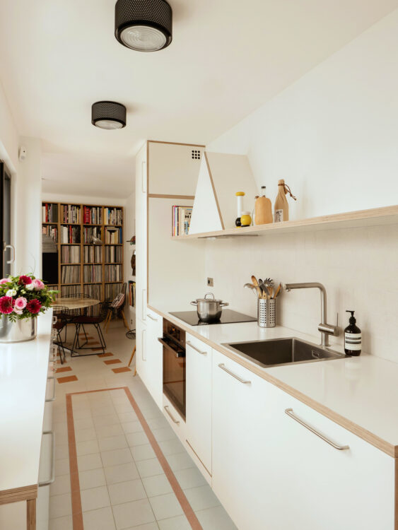 Dans la cuisine, l’ameublement sur mesure s’aligne le long du mur mitoyen, libérant au maximum les façades.
