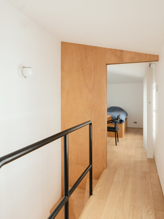 L’escalier, véritable meuble habité, se dresse comme la pièce maîtresse de l’aménagement des lieux : réalisé en contreplaqué d’okoumé, il sculpte l’entrée, organise les circulations et intègre les sanitaires en toute discrétion.
