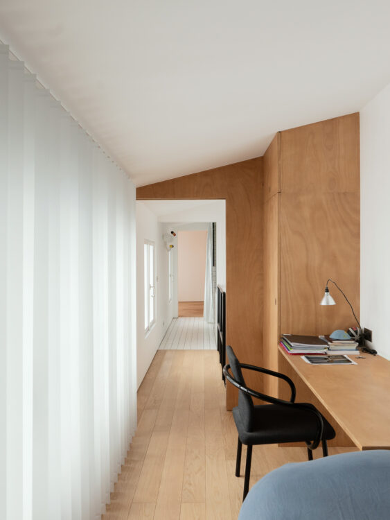 Plus haut, l’escalier se prolonge en une cloison qui intègre des rangements et un bureau, et devient ainsi la colonne vertébrale qui structure l’appartement et le réchauffe de ses teintes boisées.