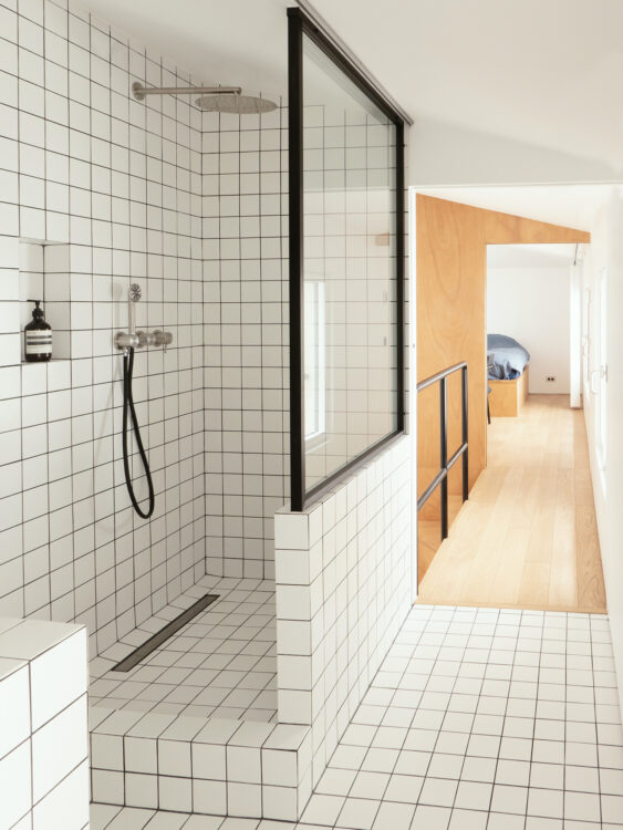 À cet étage, la distribution classique est supprimée, au profit d’un agencement plus original. Espace de transition, la salle d’eau est marquée par un “full” carrelage blanc, du sol aux murs.