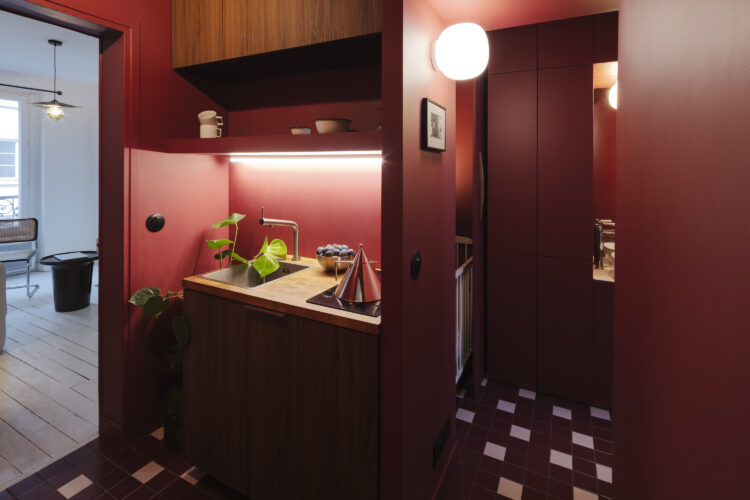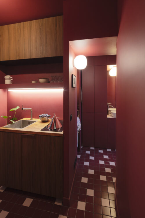 Dès l’entrée, les teintes pourpres enveloppent l’espace et installent une atmosphère intime, presque cinématographique. Seuil habité, la cuisine se niche dans une alcôve discrète. Un jeu de lumière souligne les lignes et la texture du bois clair.