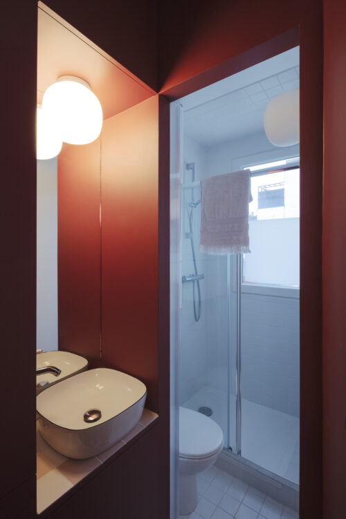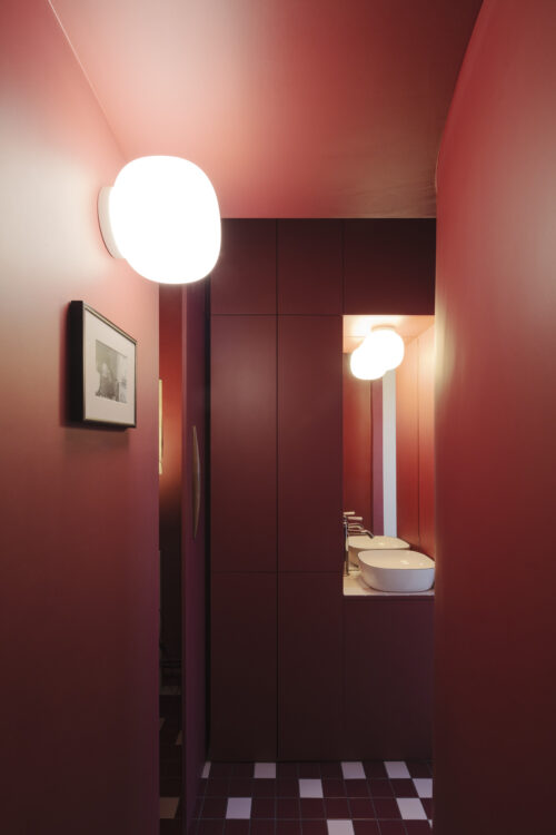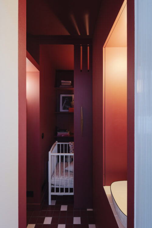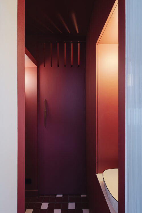 En revenant sur nos pas, le regard retrouve la profondeur du pourpre. Le couloir devient une pièce à part entière, structurant la transition entre les usages et donnant au projet sa densité.