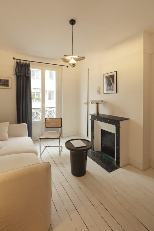 La lumière naturelle, prolongée par le blanc du parquet et des murs, imprègne la pièce. Une fois la nuit tombée, le canapé se déploie en lit et le séjour devient la chambre d’Aurélien.