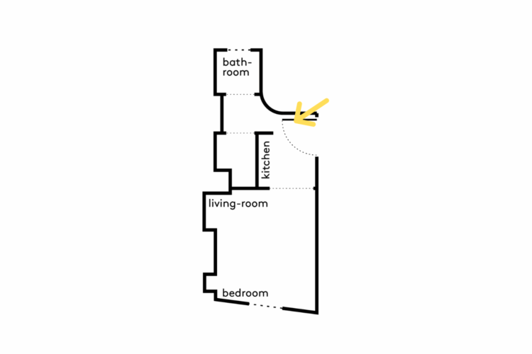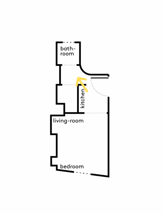 Pensée en miroir de la pièce de vie, la salle d’eau se dévoile, blanche et fonctionnelle. Grâce à une fenêtre ouverte sur l’arrière de l’immeuble, la lumière naturelle circule et donne à l’appartement une lecture presque traversante.