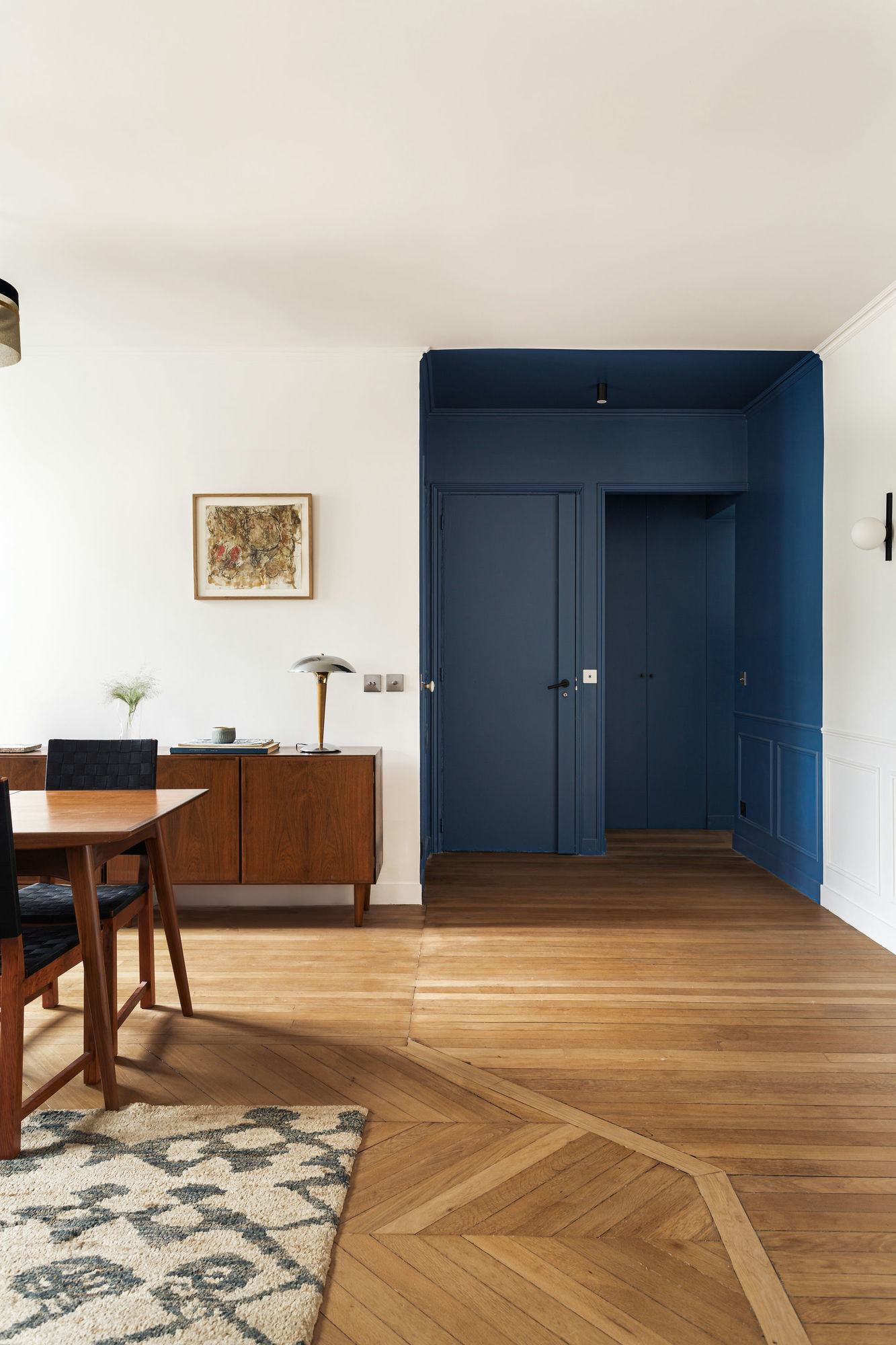 Joyeuse, l’entrée est matérialisée par la couleur : une astuce pour créer un repère visuel et délimiter les espaces, même sans cloison ! En bonus : un petit effet 3D qui offre un twist moderne à l’enveloppe haussmannienne de cet appartement.