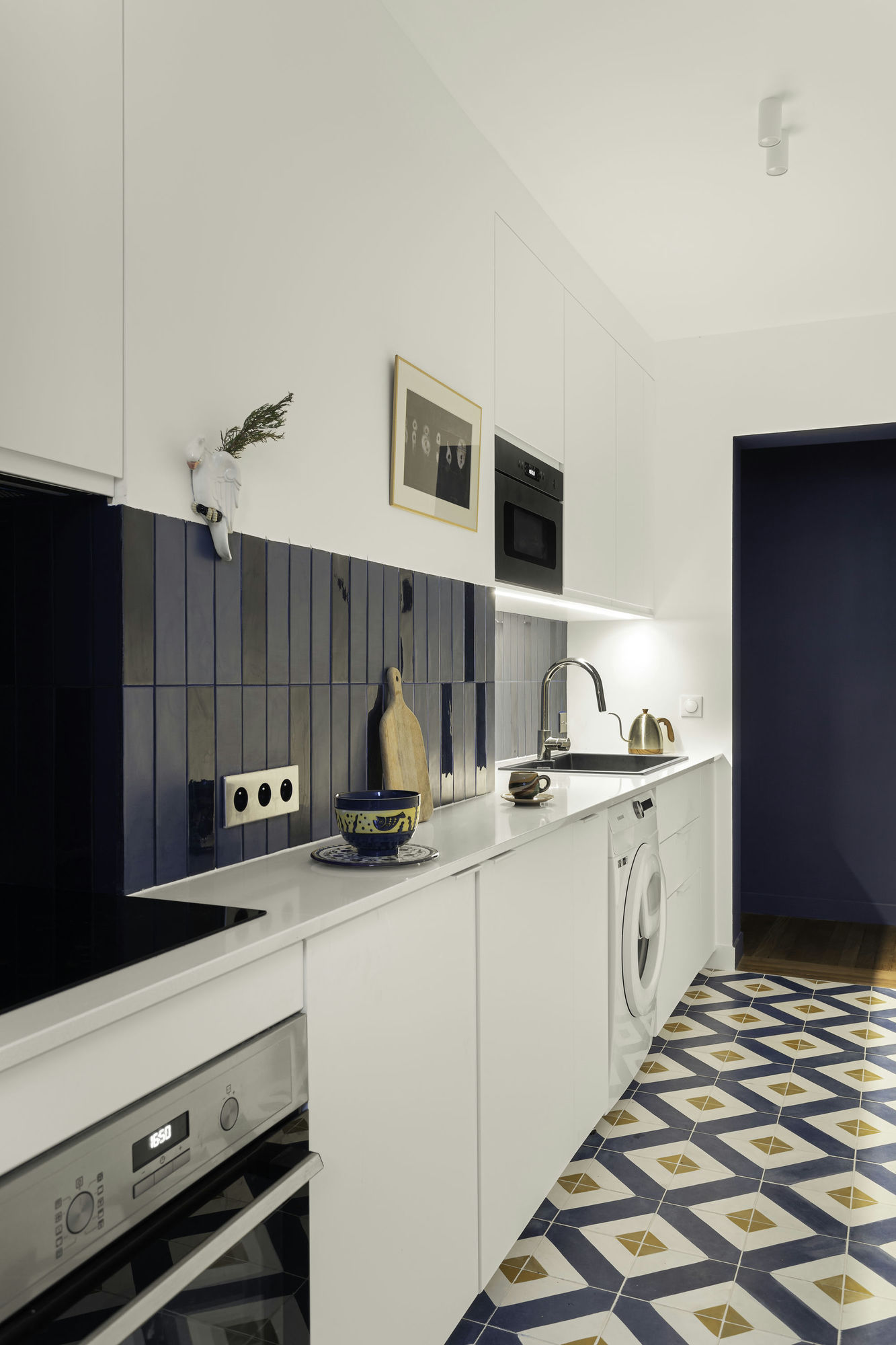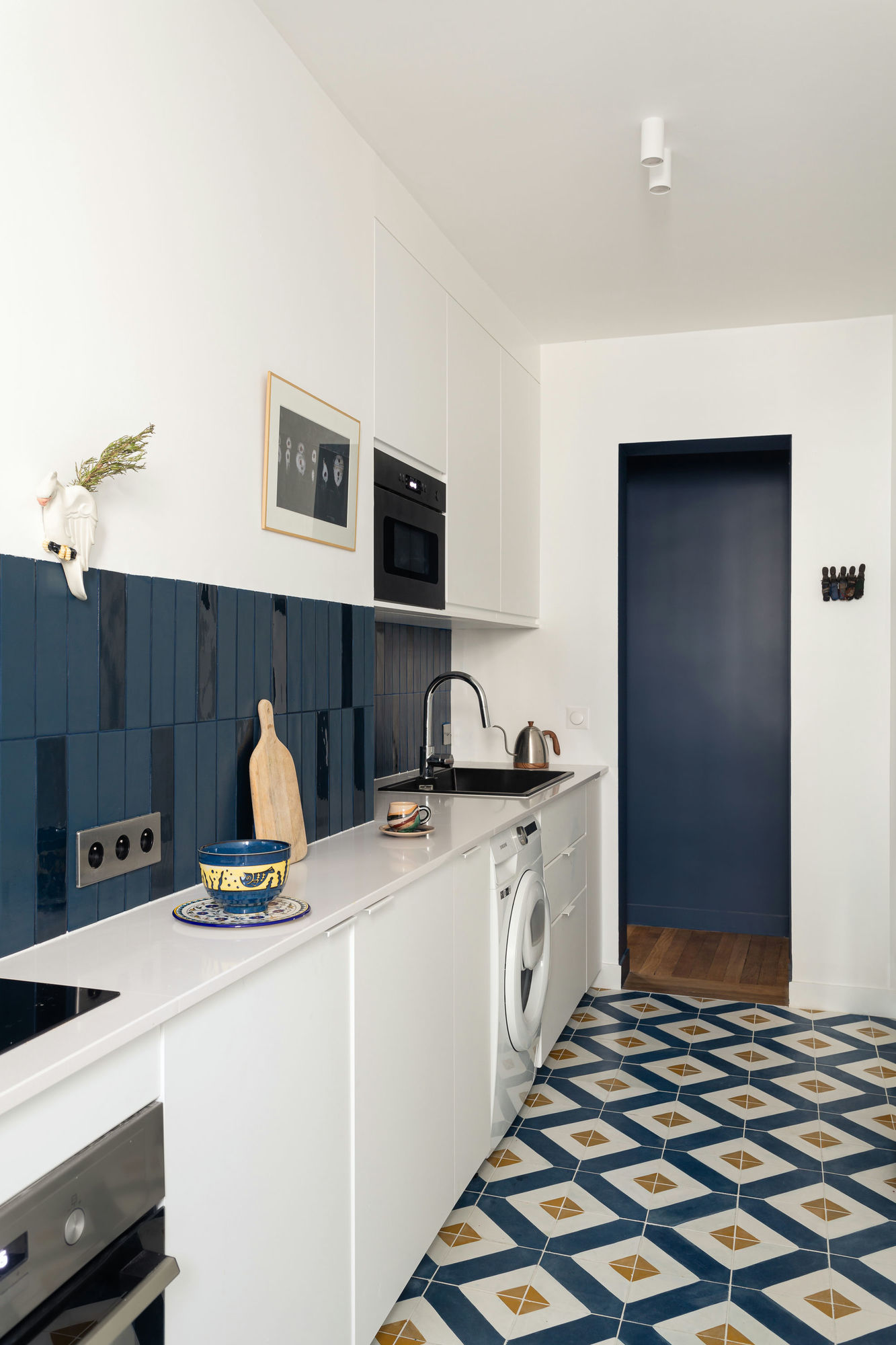 La cuisine poursuit l’immersion dans le grand bleu ! Cette couleur s’inscrit systématiquement dans la profondeur, que ce soit pour la perspective de l’entrée ou pour la crédence. Associée au blanc immaculé, il y a ici un vrai petit air des Cyclades !