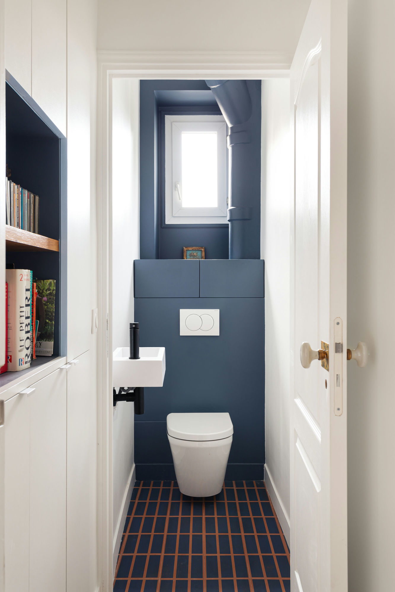 Près de l’entrée, les W.-C., se révèlent en passant par un petit sas. Ce dernier est aménagé de placards et d’une petite bibliothèque : optimisation de l’espace toujours !