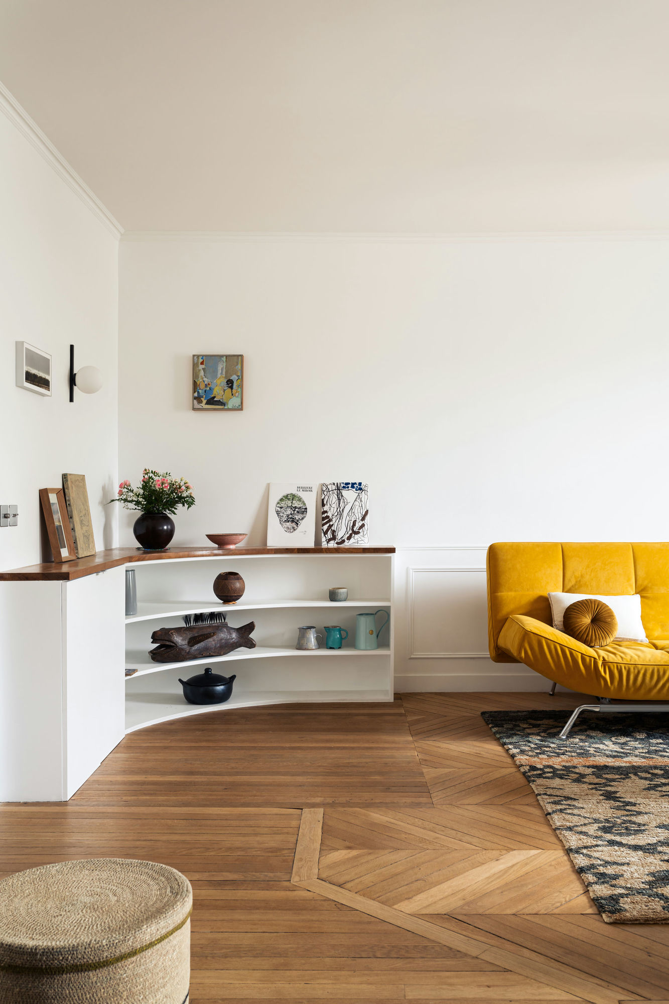 Dans un séjour agrandi à 29 m², le parquet d’origine conserve volontairement les traces du précédent plan. Laissées apparentes, les limites de l’ancienne salle d’eau créent ainsi des lignes irrégulières qui insufflent une touche supplémentaire de vécu et de personnalité.