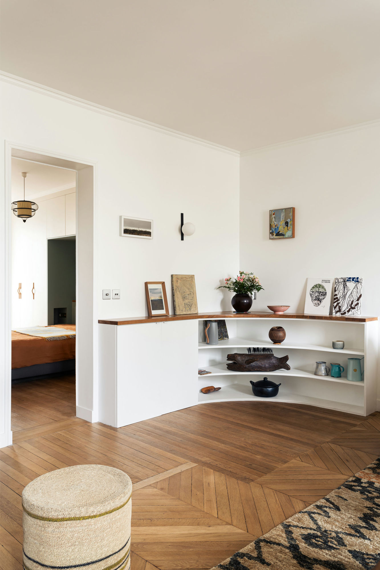 Un buffet intégré et dessiné sur mesure habille cet angle du salon. Il prend la forme d’une courbe qui accompagne élégamment la circulation vers la première chambre.
