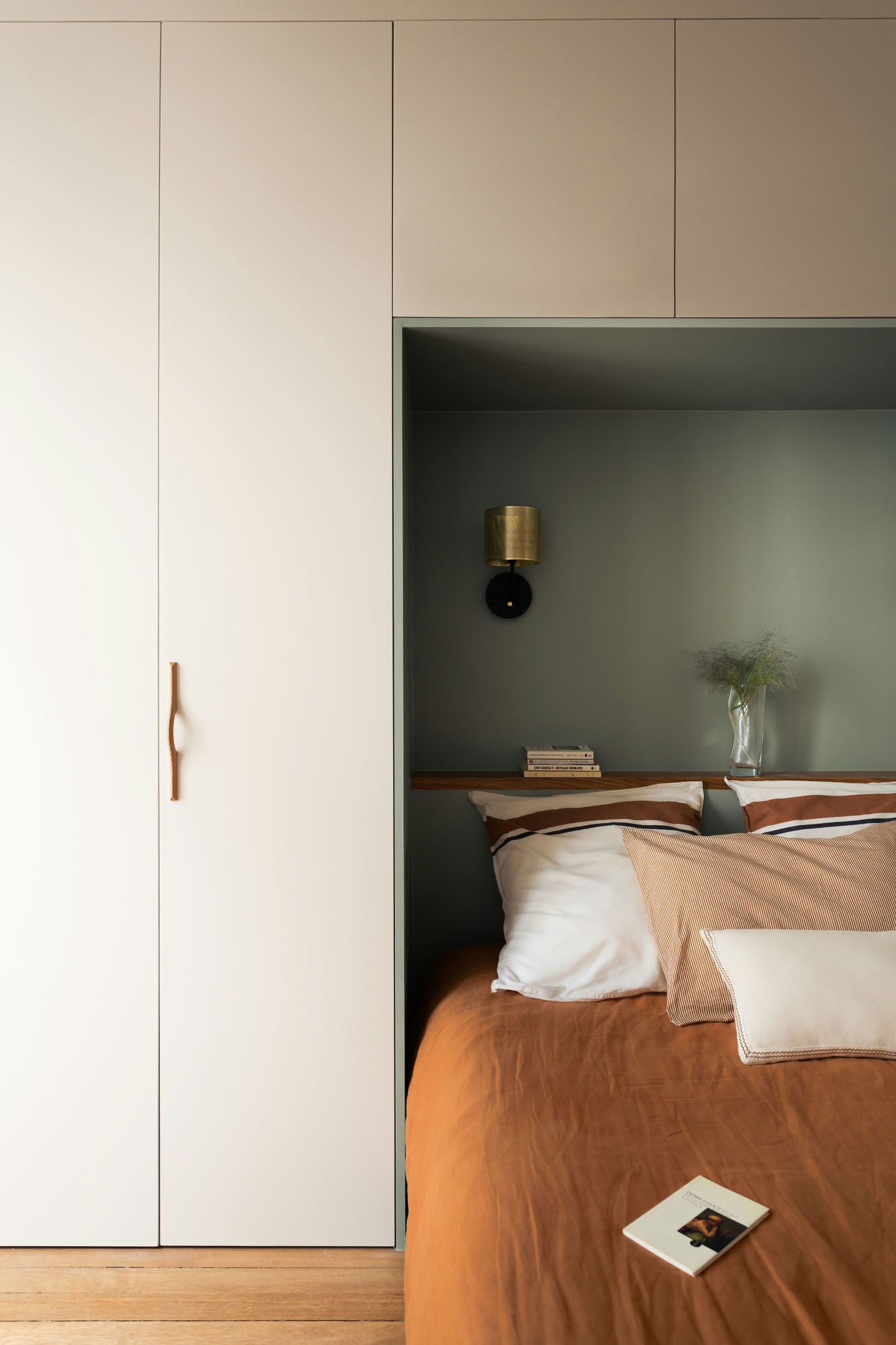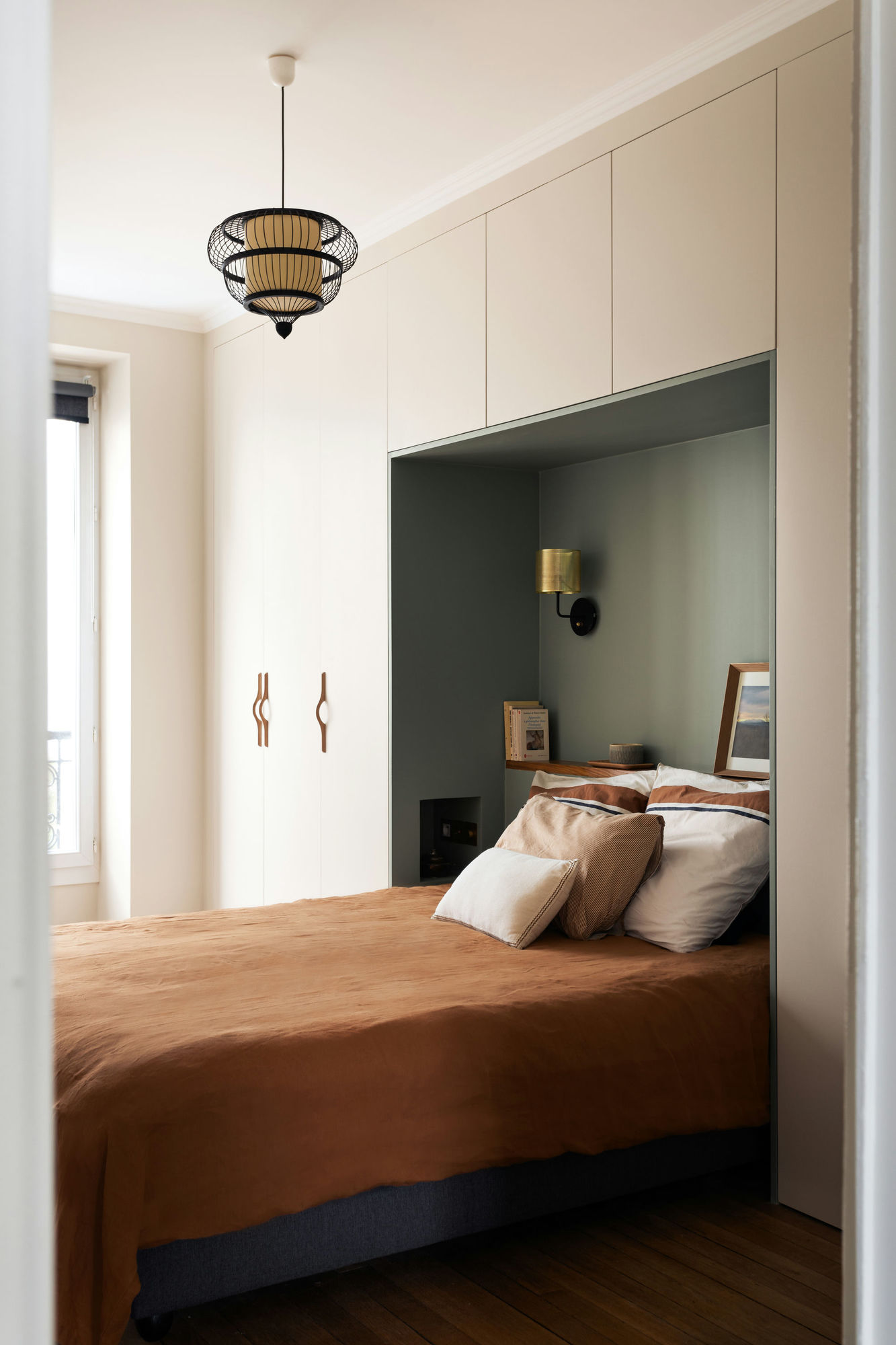 Les façades sont peintes d’une teinte douce et apaisante baptisée “Craie”, de chez @ressource_paint. L’alcôve, elle, se pare d’un élégant vert amande qui accepte volontiers le contraste avec des couleurs chaudes.