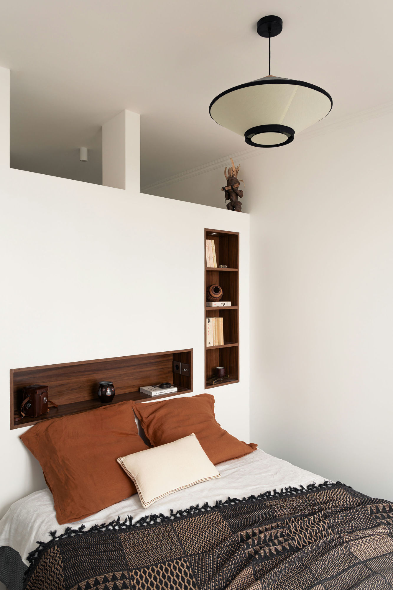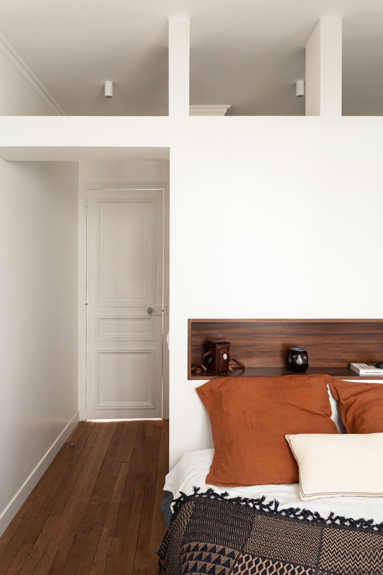 Place à la seconde chambre et sa tête de lit maçonnée. L’ambiance est ici un peu plus brute et aux accents exotiques, notamment grâce à l’emploi de placages en bois foncé.