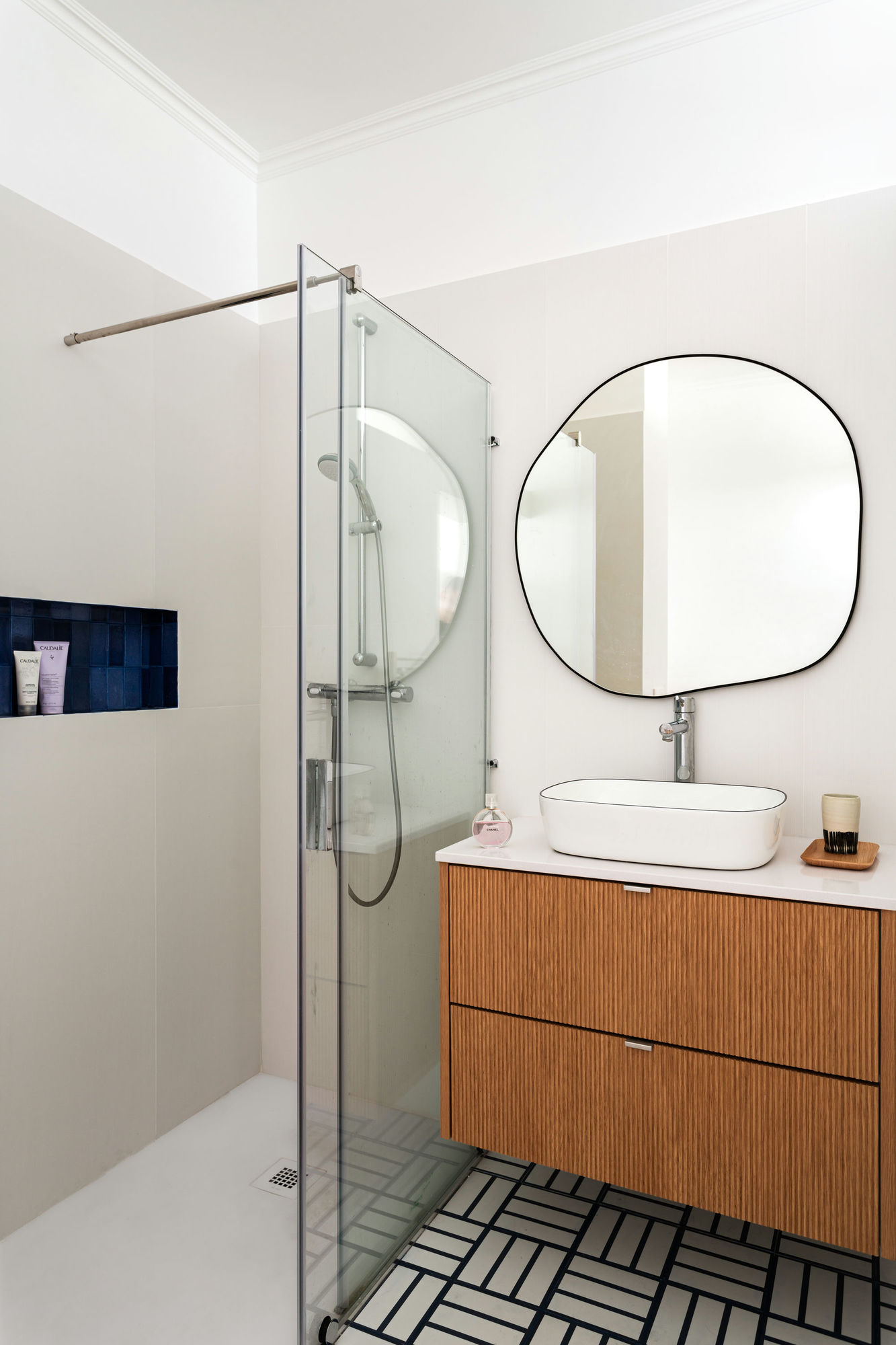 C’est la salle d’eau qui se dévoile ! À noter qu’elle est accessible aux invités depuis le séjour, sans avoir à passer par la chambre. Le meuble vasque aux façades texturées est une composition @bocklip, spécialiste de la personnalisation de meubles @ikea.