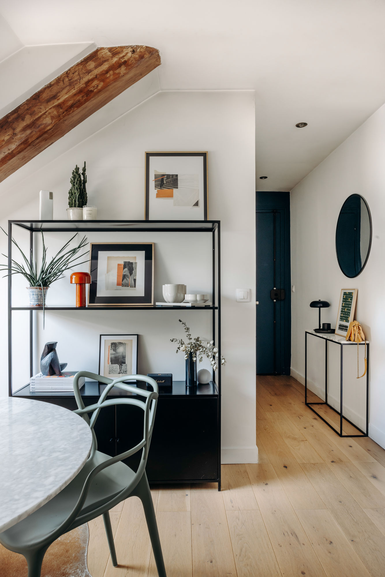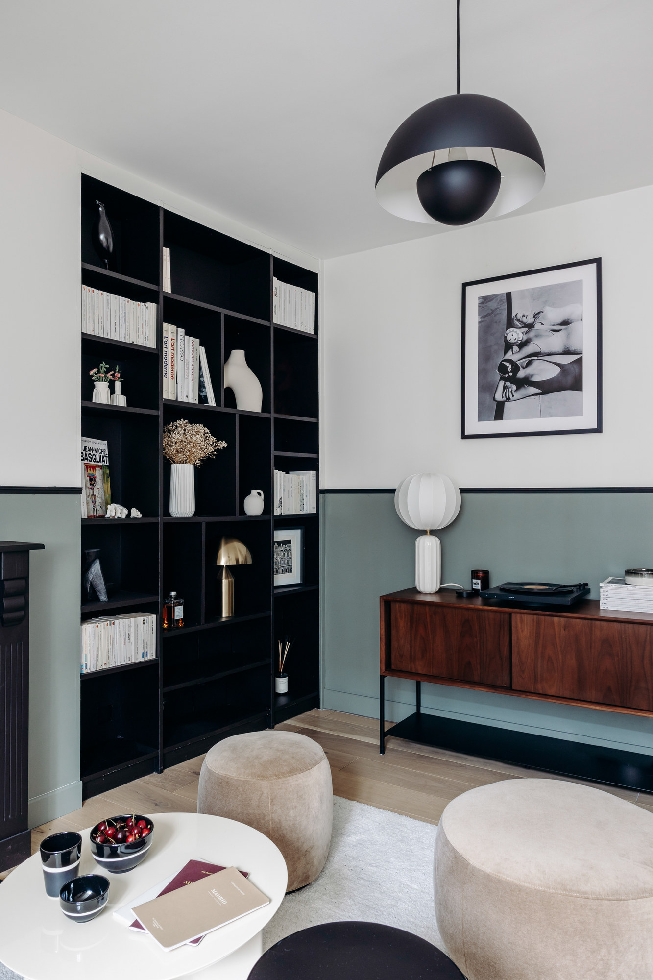 Comme dans la cuisine, les formes arrondies du mobilier viennent s’opposer aux lignes droites structurelles de l’appartement. Ici, suspension et bibliothèque semblent en pleine discussion.