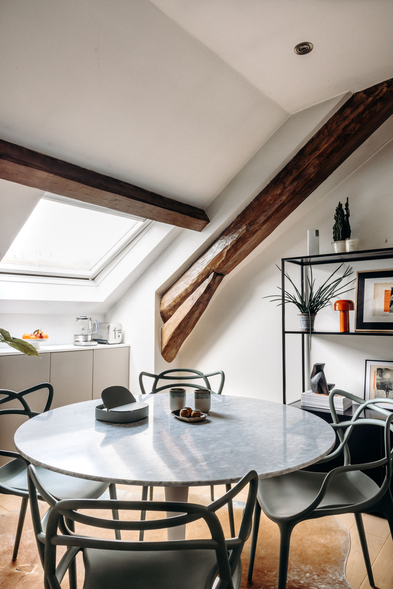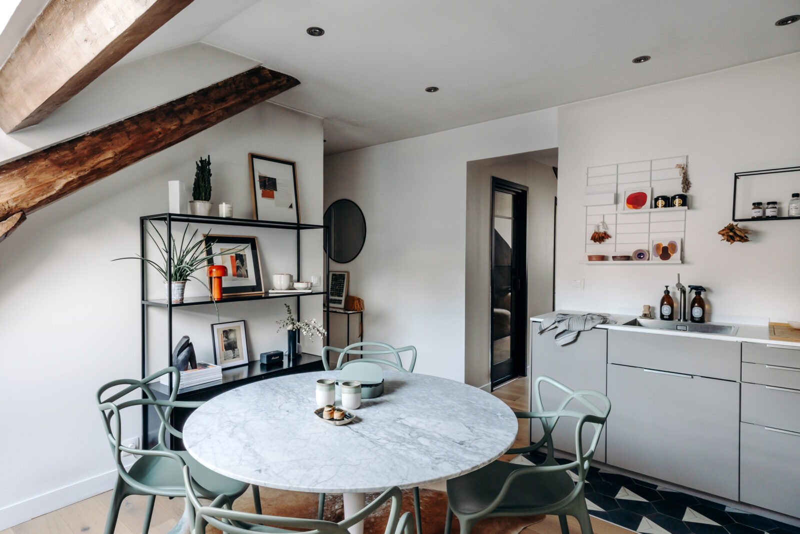 La table et les chaises vert d’eau contrastent avec les lignes droites tracées par les poutres et le plan de travail. Ici commence un dialogue qui se poursuit dans la seconde partie de l’appartement…