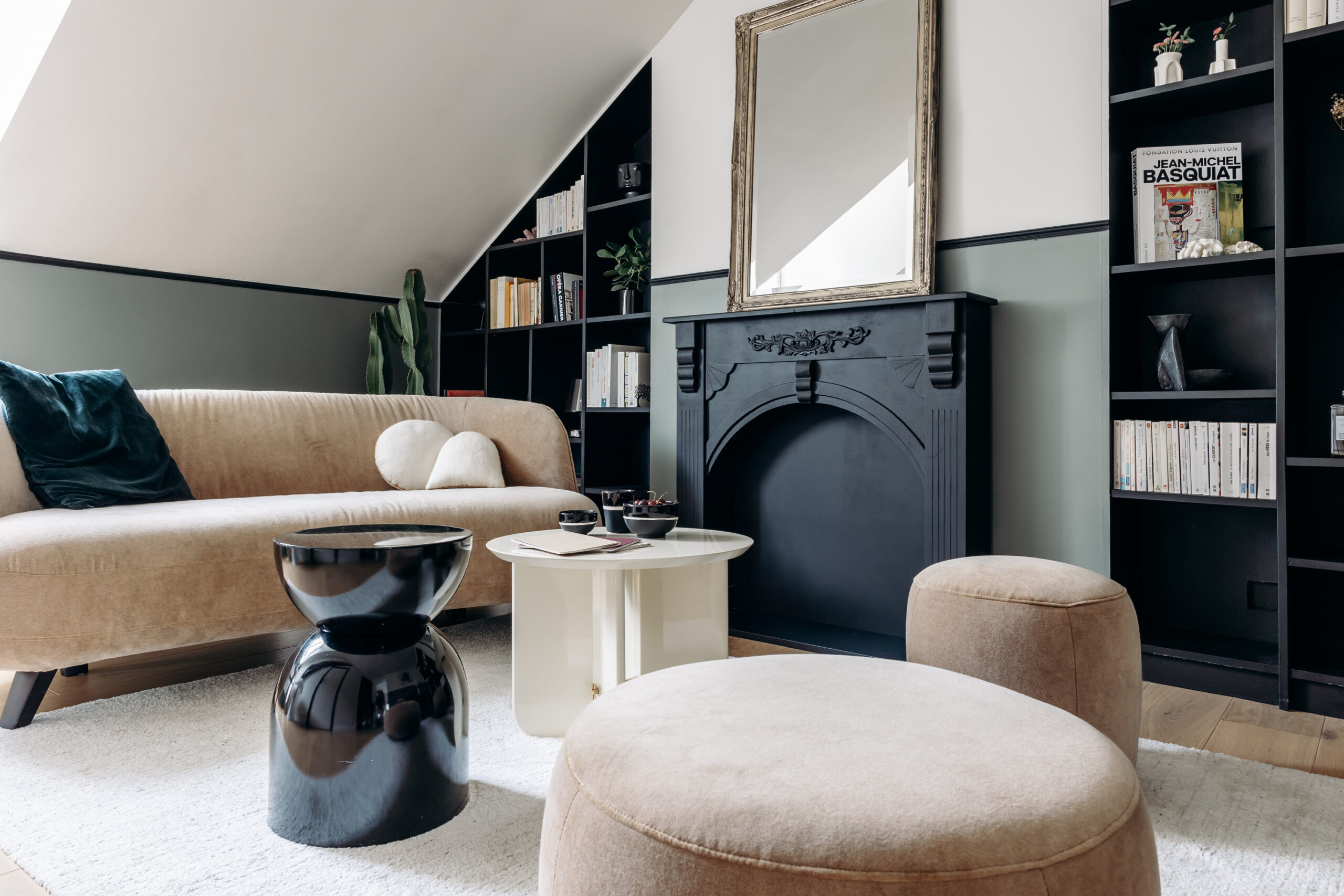 De ce côté, le séjour a été très légèrement réduit pour libérer la place nécessaire à la création d’un nouveau coin nuit. Meubles courbes, bibliothèques encastrées et accent vert “pique-nique” sont soigneusement choisis pour donner à la pièce une aura tout autant fonctionnelle que relaxante. On remarque le manteau de cheminée décoratif qui apporte du caractère à l’ensemble.