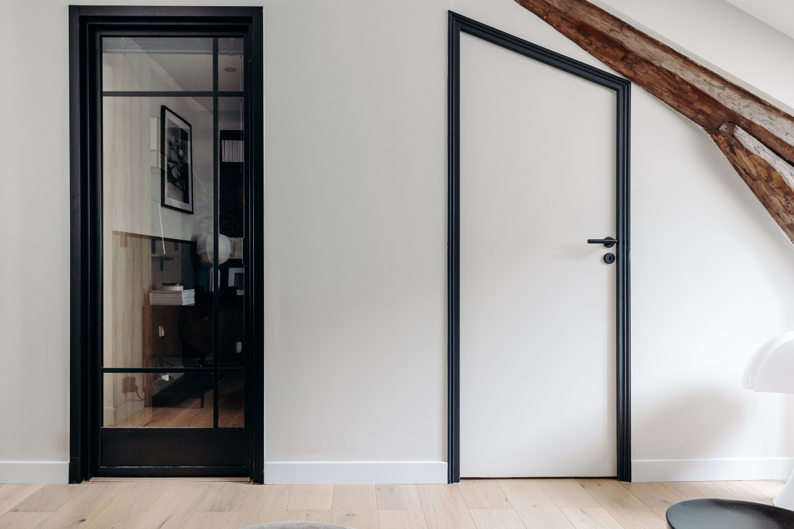 Sur le mur opposé, deux portes permettent maintenant d’accéder à la chambre principale pour l’une et au nouvel espace nuit pour l’autre. Pour ce dernier, le choix d’une porte-verrière est privilégié afin de laisser filtrer un maximum de lumière depuis le séjour.