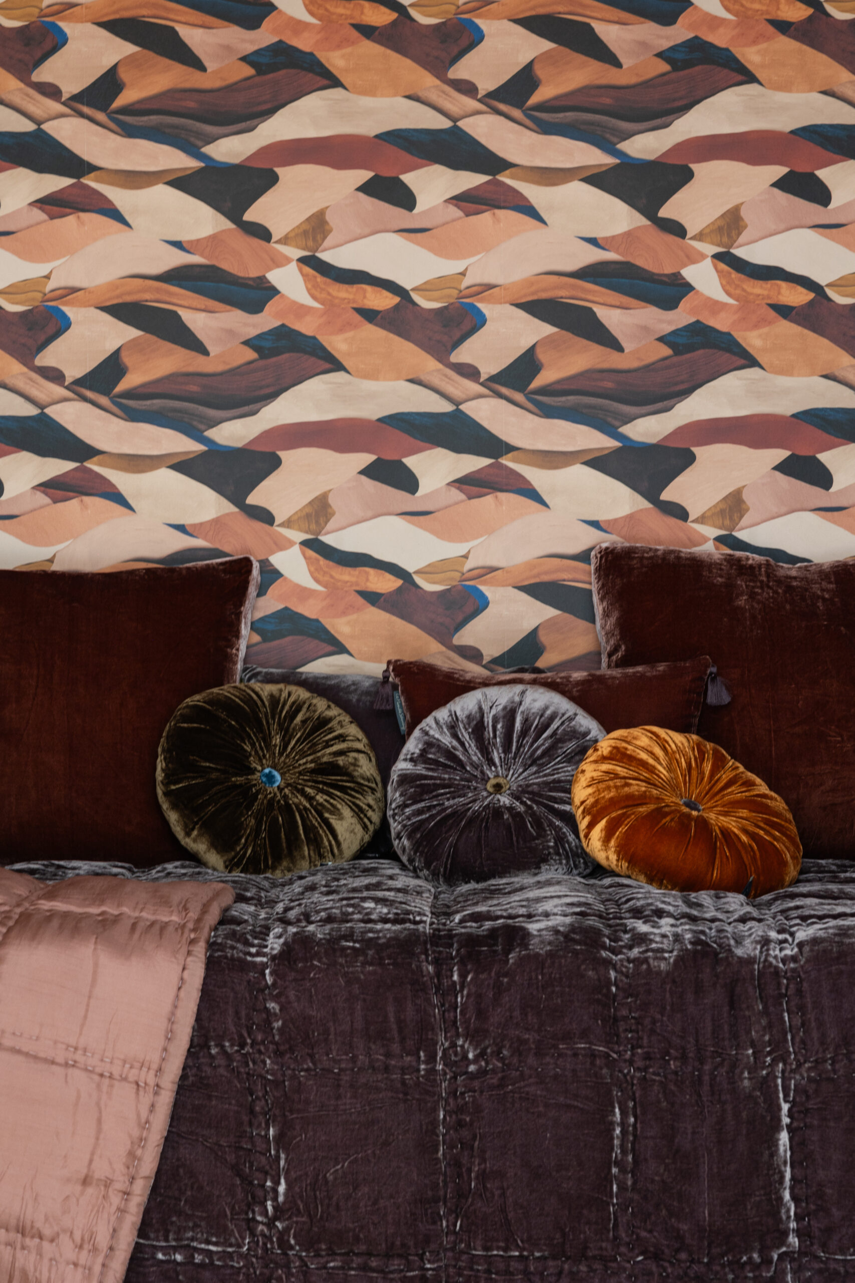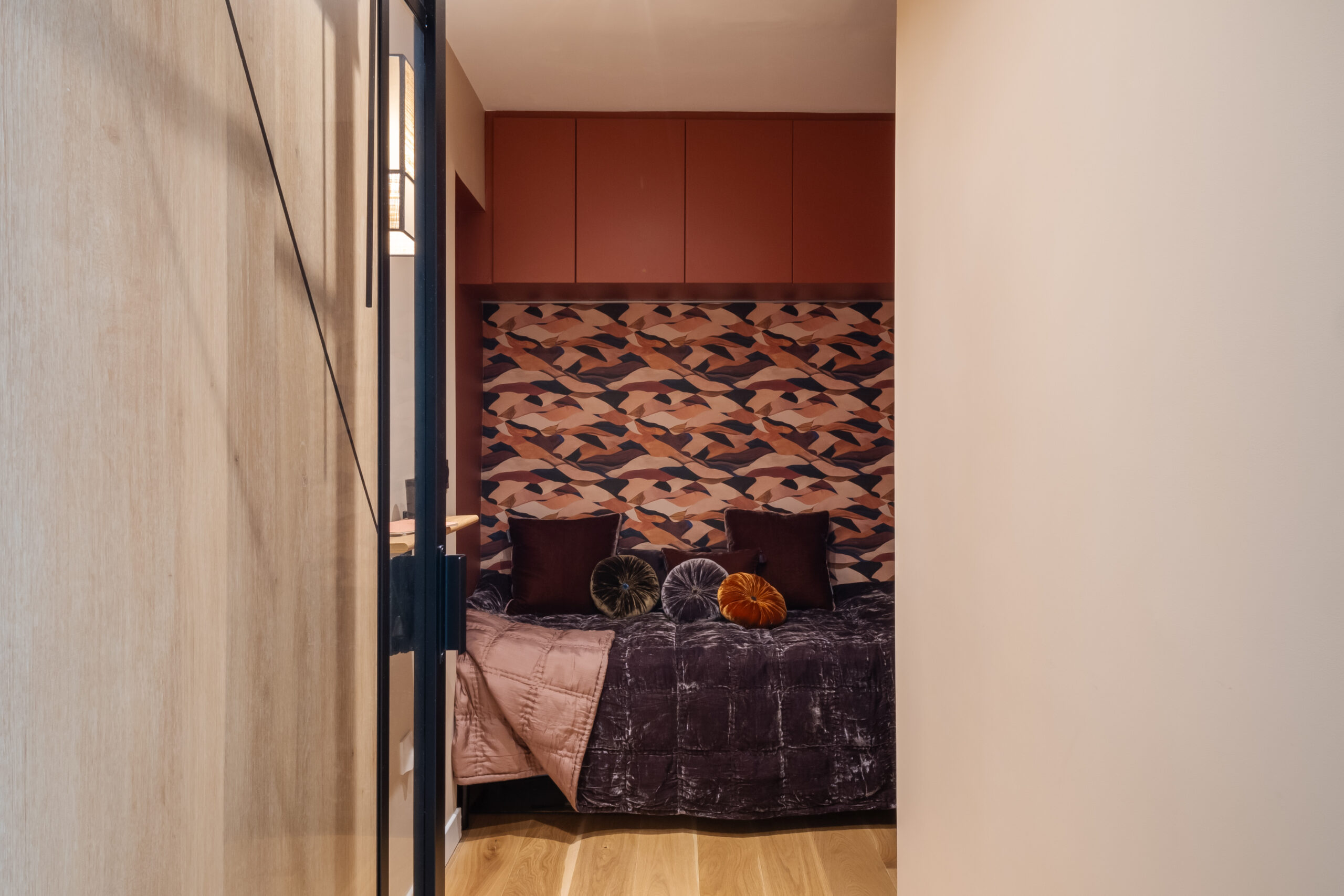 La décoration finit de transformer la pièce en véritable cocon. Placards terre de Sienne, papier peint graphique, coussins pourpre, ocre et bleu nuit en velours de soie… Qui a dit qu’espace compact ne peut pas rimer avec expérience luxueuse ?