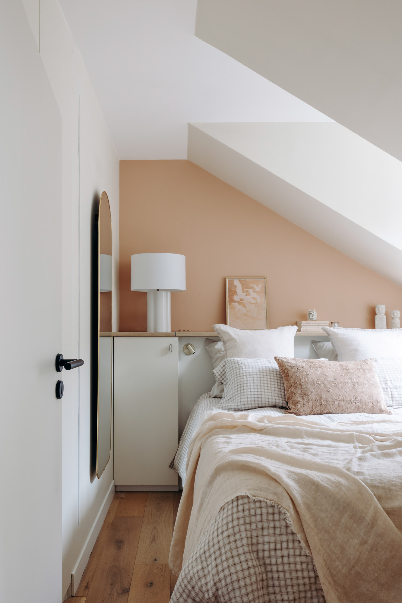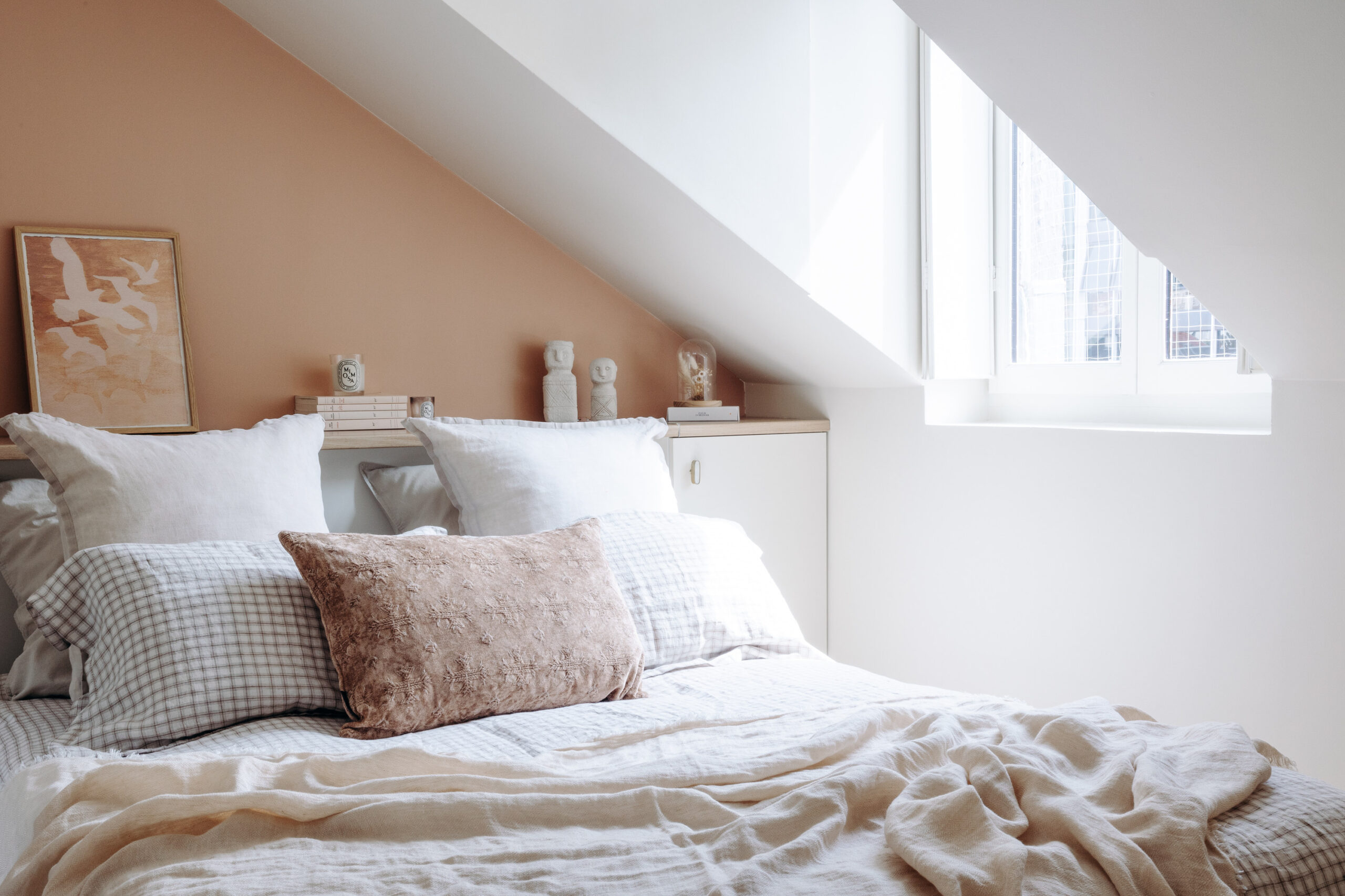 Au mur et jusque dans le linge de lit, un joli rose poudré vient revitaliser la pièce en douceur.