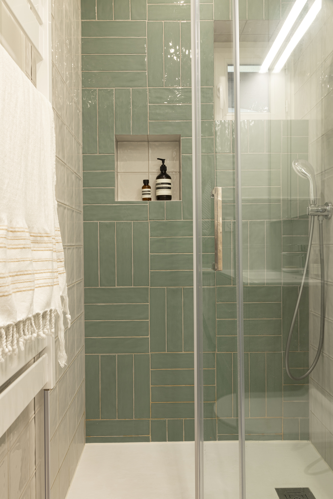 On termine la visite avec la salle d’eau. Ses touches d’asymétrie et de céladon s’accordent avec la cuisine adjacente pour créer un ensemble harmonieux.