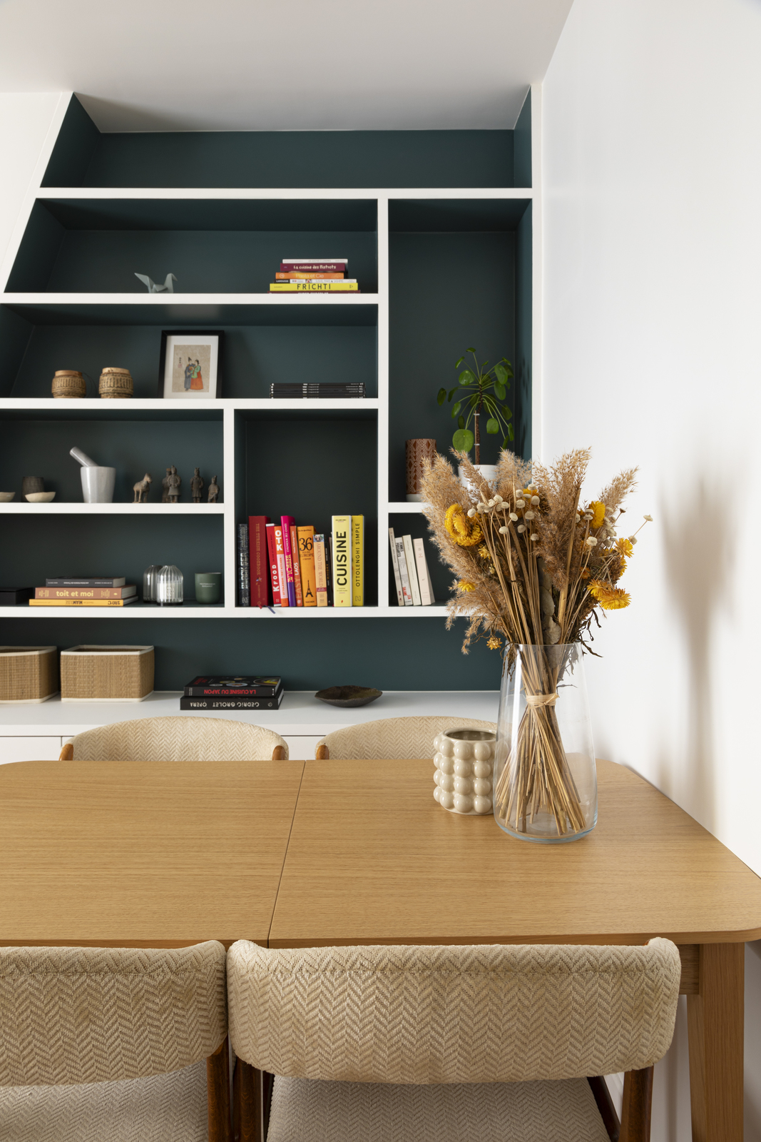 Placé dans l’ancienne chambre, le séjour s’orne d’une bibliothèque bicolore profitant des niches de l’ancien conduit de cheminée.