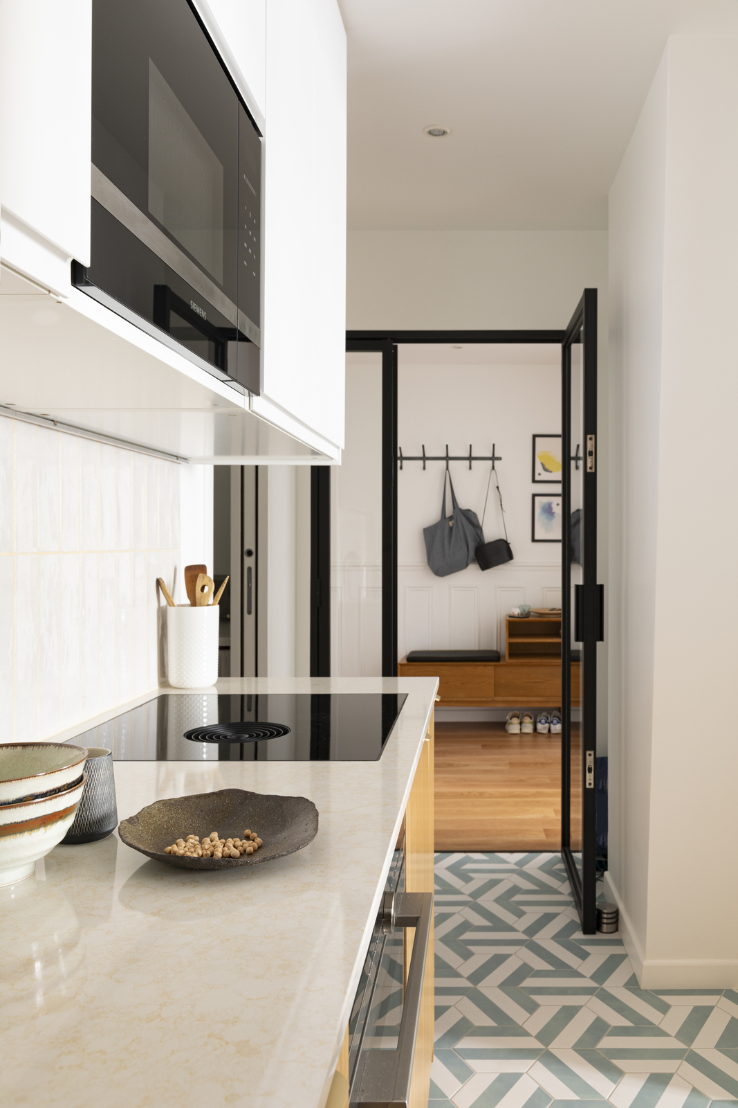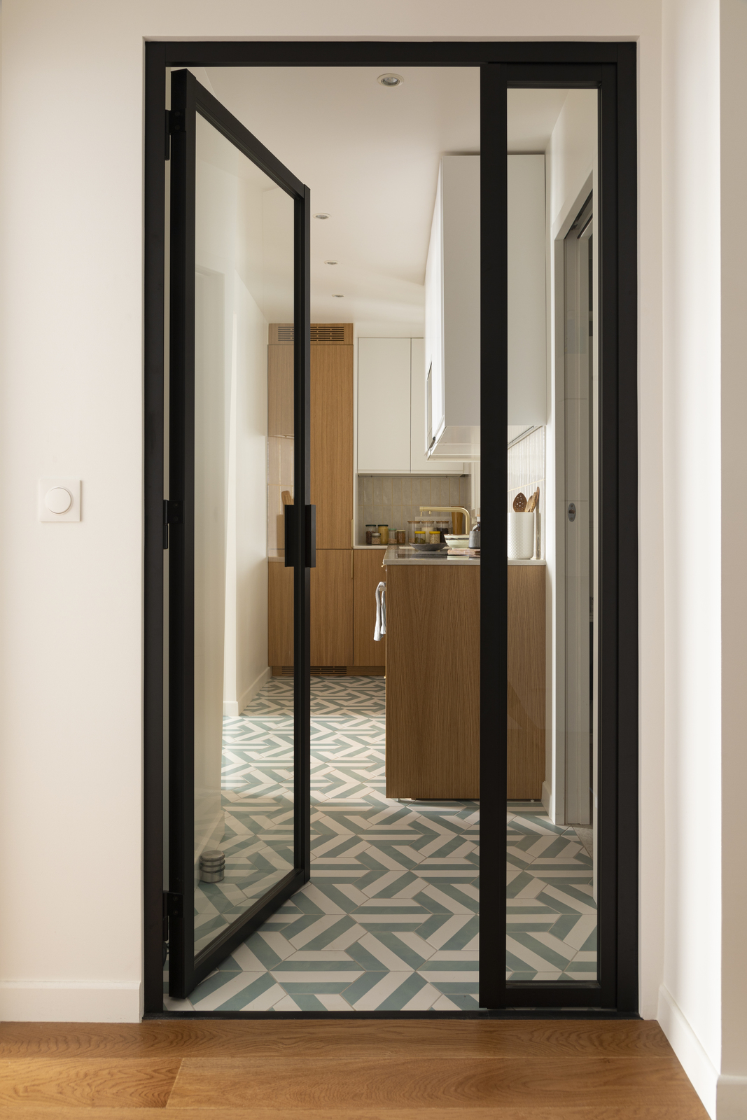 Une porte verrière sur mesure ouvre sur la cuisine et fait circuler la lumière entre les pièces.
