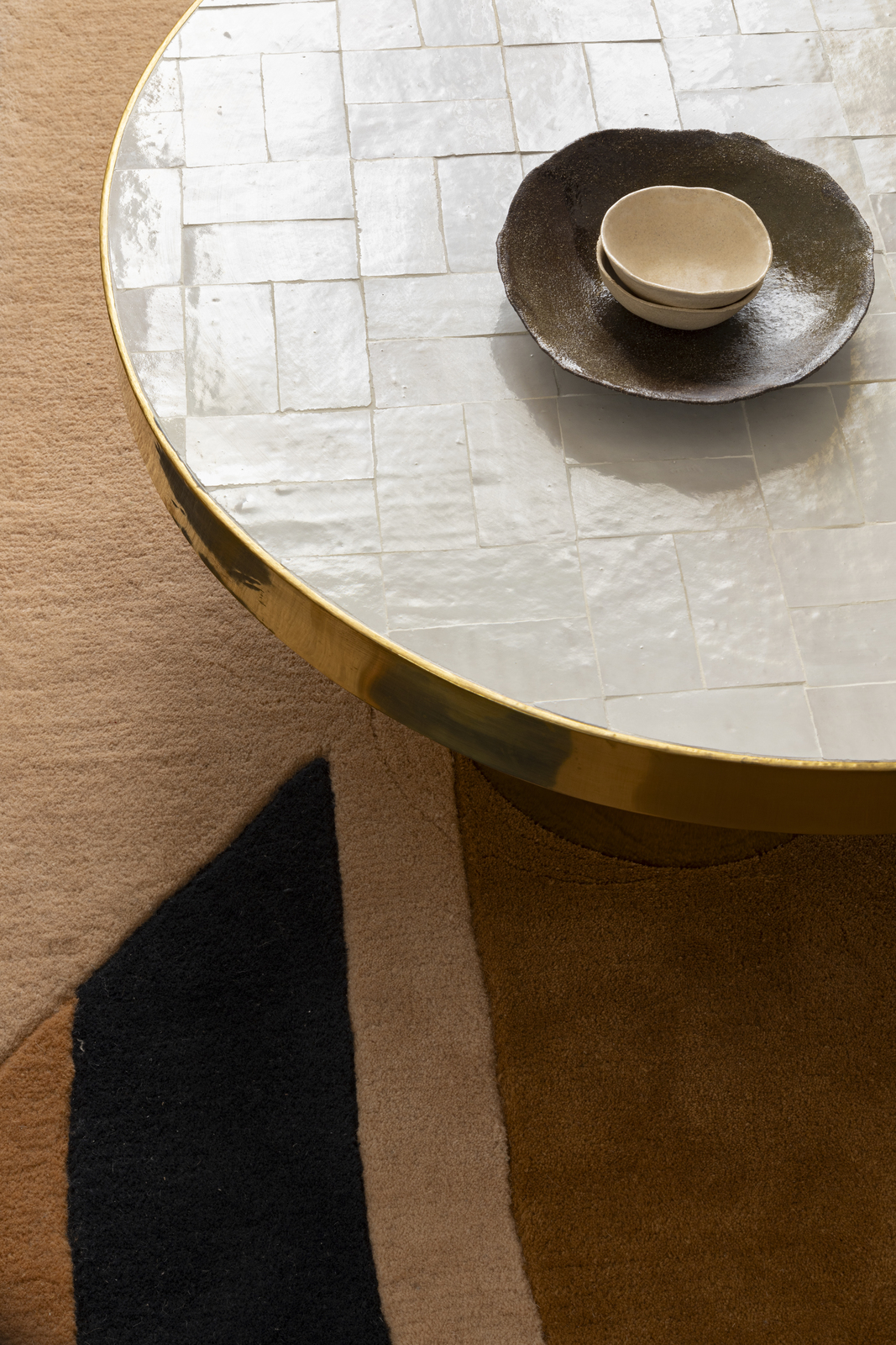 Zoom sur la table basse, dont les zelliges font écho à la crédence de la cuisine.