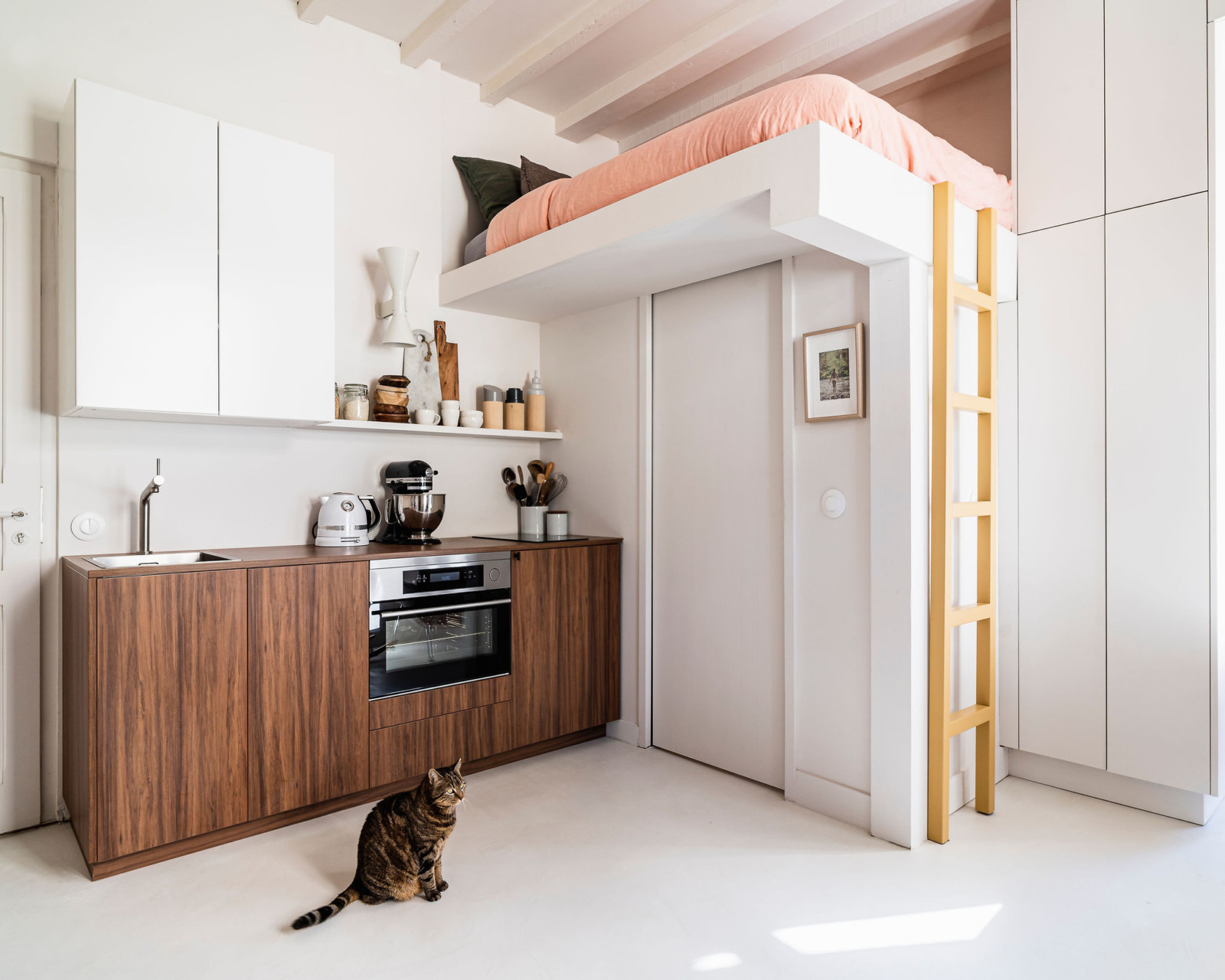 La cuisine et ses façades en noyer amènent une touche de contraste et de chaleur, tandis qu’en hauteur un placard et une étagère se fondent dans le mur pour un résultat aérien.