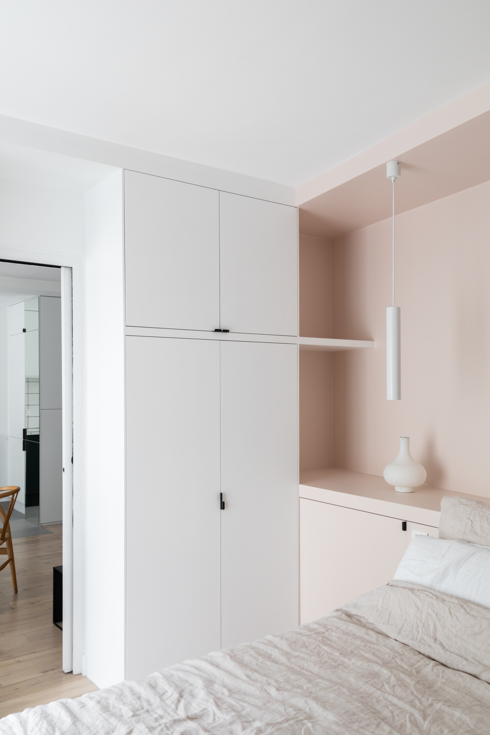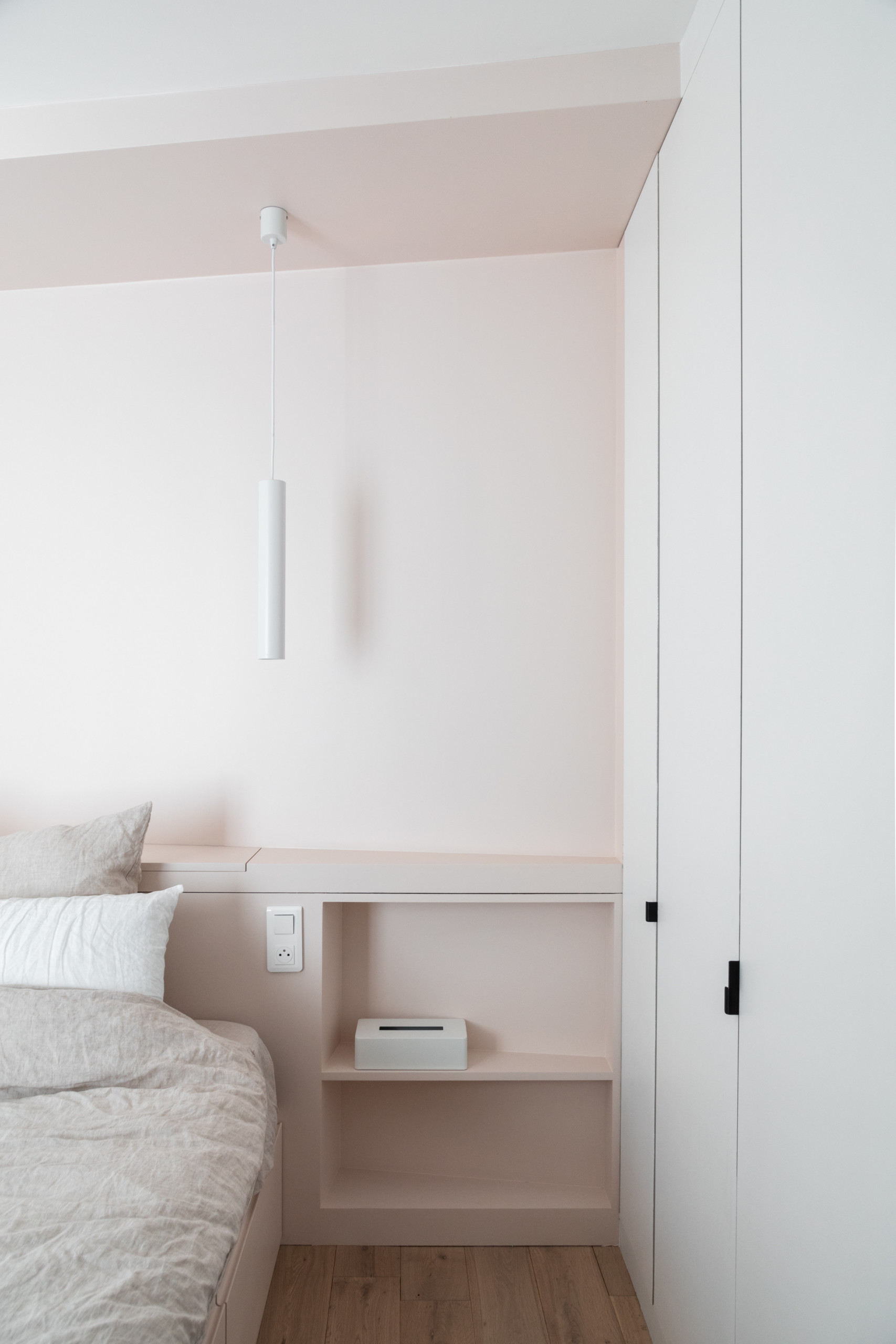 Seuls le lit et les luminaires meublent la pièce. Les chevets ont été conçus sur-mesure et intégrés au mur dans un aspect pratique et minimal. Dans cette chambre, le superflu est proscrit.